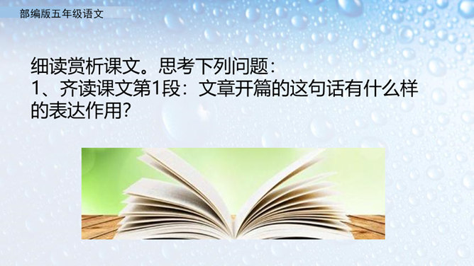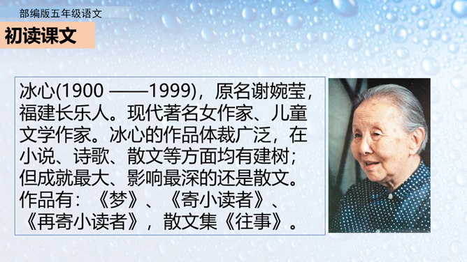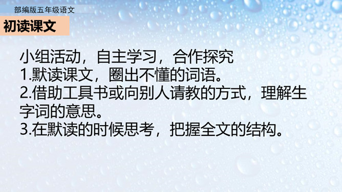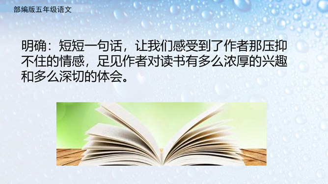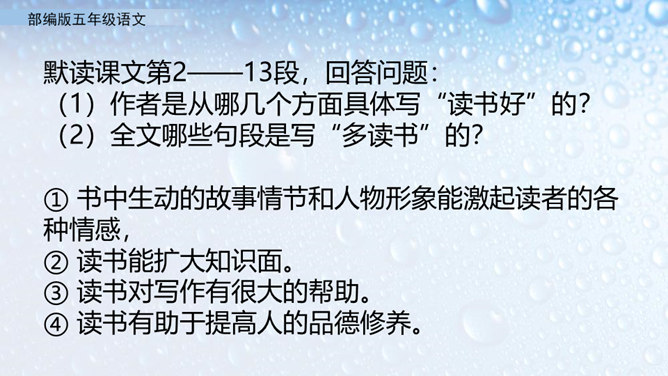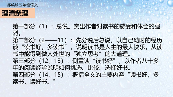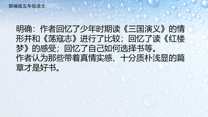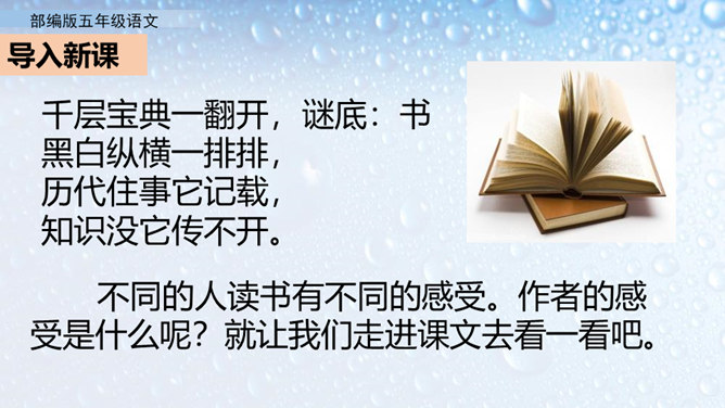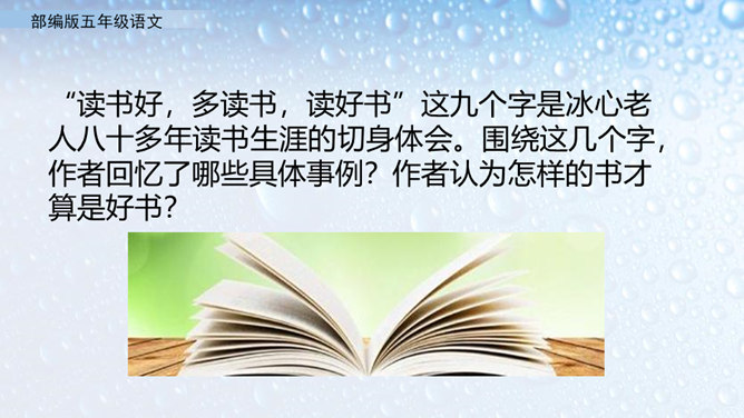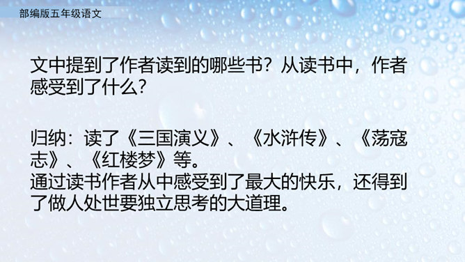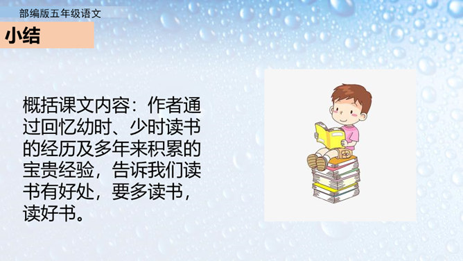 不同的人读书有不同的感受。作者的感受是什么呢?就让我们走进课文去看一看吧。小组活动,自主学习,合作探究。默读课文,圈出不懂的词语。借助工具书或向别人请教的方式,理解生字词的意思。在默读的时候思考,把握全文的结构。概括课文内容:作者通过回忆幼时、少时读书的经历及多年来积累的宝贵经验,告诉我们读书有好处,要多读书,读好书。掌握生字词。继续阅读课文,把握课文内容。在阅读中体会读书的好处,自己受到了怎样的启发。所属专题:忆读书ppt。