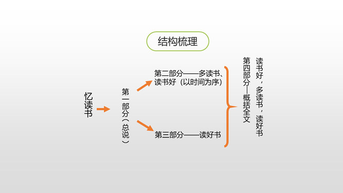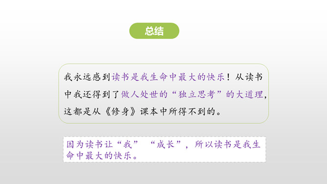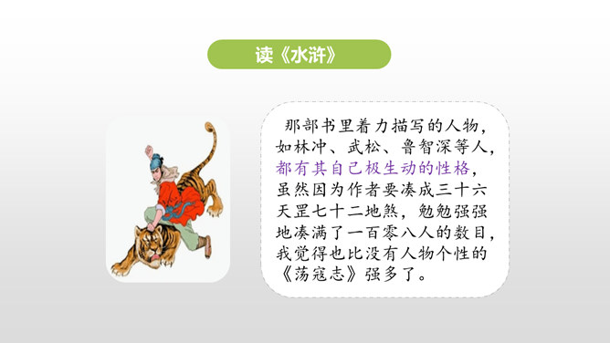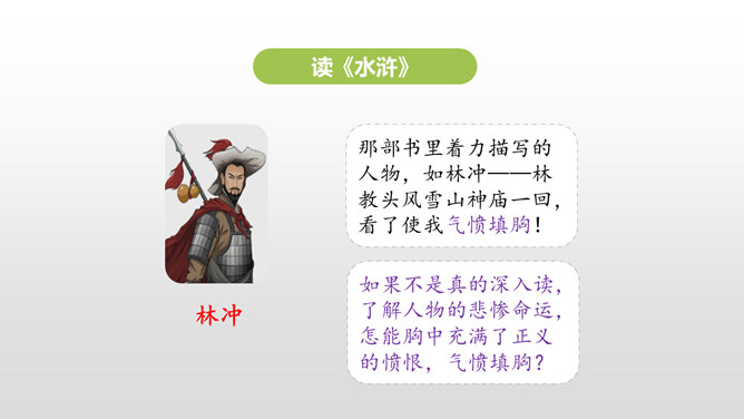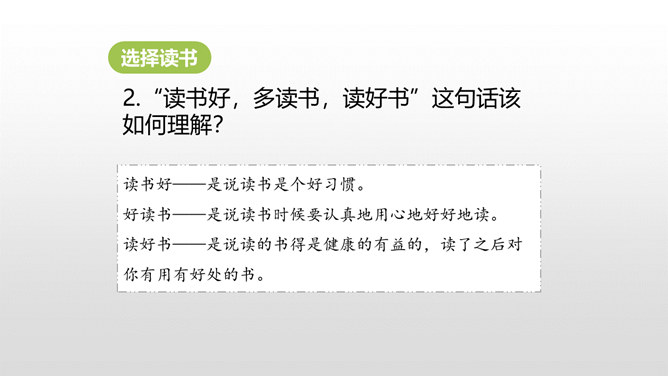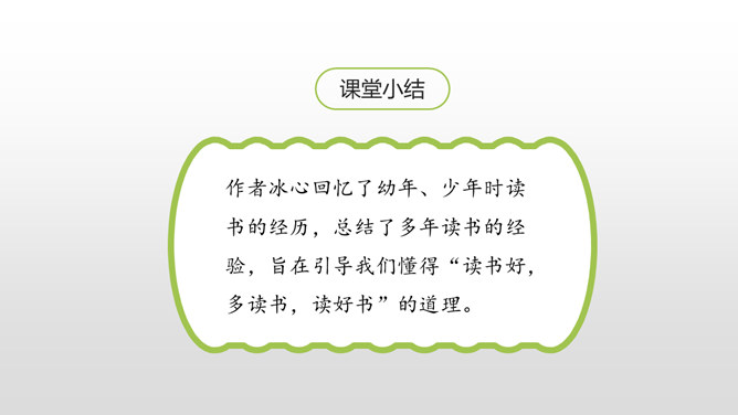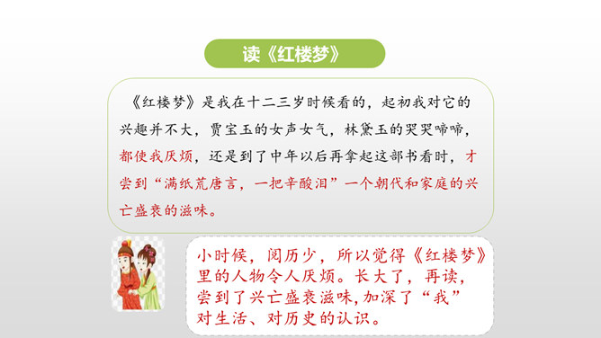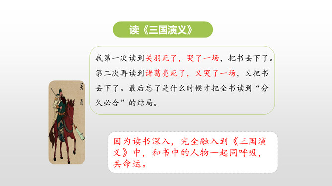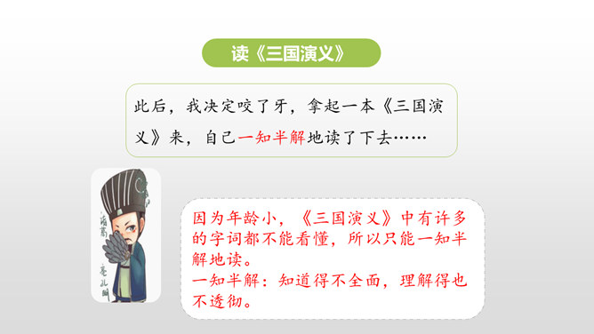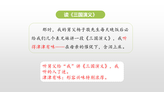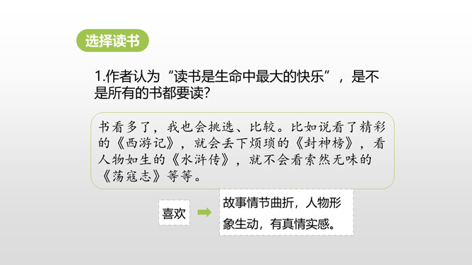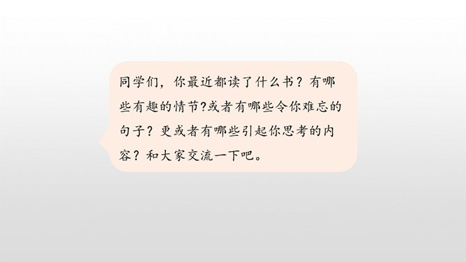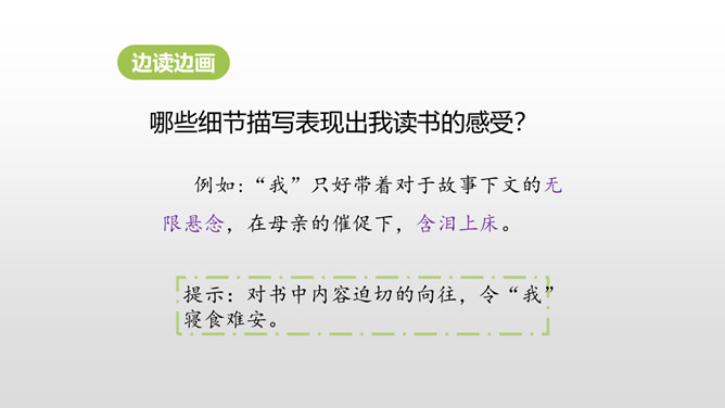 同学们,你最近都读了什么书?有哪些有趣的情节?或者有哪些令你难忘的句子?更或者有哪些引起你思考的内容?和大家交流一下吧。哪些细节描写表现出我读书的感受? 例如:“我”只好带着对于故事下文的无限悬念,在母亲的催促下,含泪上床。提示:对书中内容迫切的向往,令“我”寝食难安。因为年龄小,《三国演义》中有许多的字词都不能看懂,所以只能一知半解地读。一知半解:知道得不全面,理解得也不透彻。所属专题:忆读书ppt。