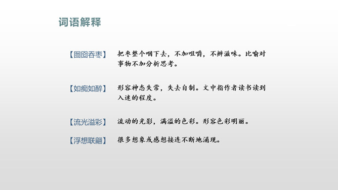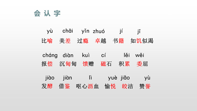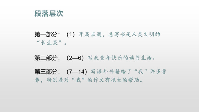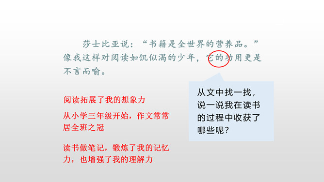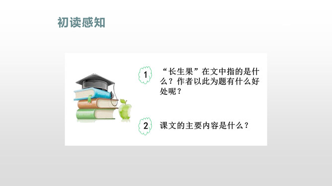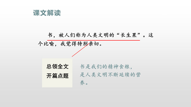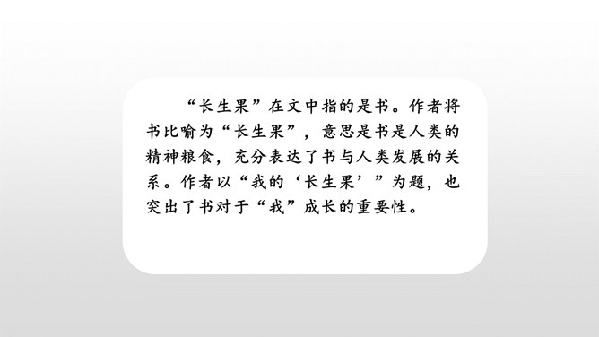 “长生果”在文中指的是什么?作者以此为题有什么好处呢?课文的主要内容是什么?“长生果”在文中指的是书。作者将书比喻为“长生果”,意思是书是人类的精神粮食,充分表达了书与人类发展的关系。作者以“我的‘长生果’”为题,也突出了书对于“我”成长的重要性。自读课文2-13自然段,找找作者写了自己少年时代读书、作文的哪几件事?书具有丰富的营养,在我们的成长中起着重要的作用。只要我们爱读书,并且孜孜不倦地去博览群书,学以致用,就一定会书写出自己美丽的人生。所属专题:我的长生果ppt。