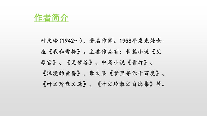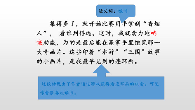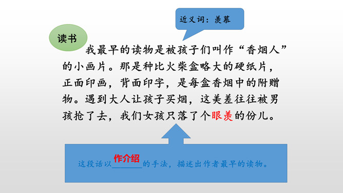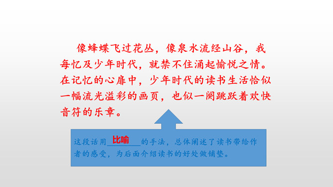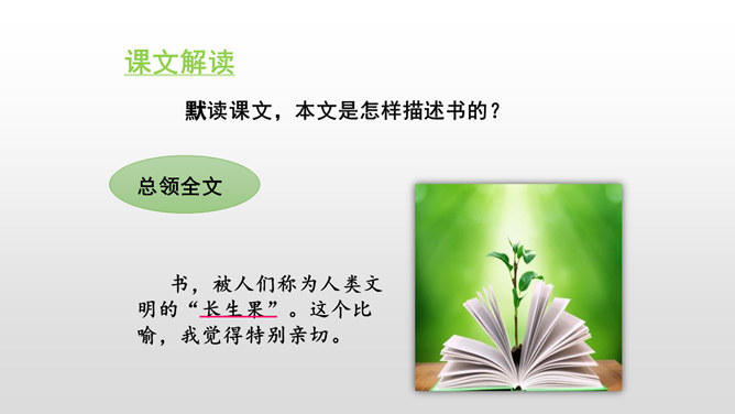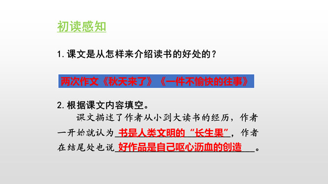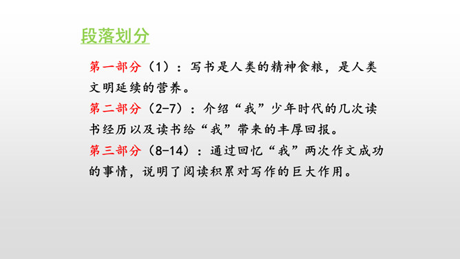 第一部分(1):写书是人类的精神食粮,是人类文明延续的营养。第二部分(2-7):介绍“我”少年时代的几次读书经历以及读书给“我”带来的丰厚回报。第三部分(8-14):通过回忆“我”两次作文成功的事情,说明了阅读积累对写作的巨大作用。把描写“我”少年时代读书的感受的句子抄下来。看看读书带给我们什么,将自己在读书中的收获写成一个小片段,不用太长,表达要有感情。所属专题:我的长生果ppt。