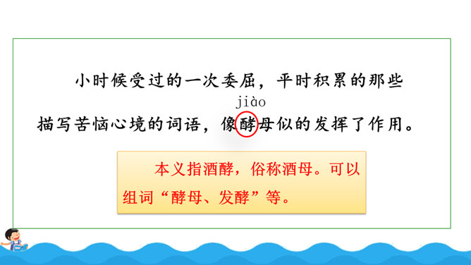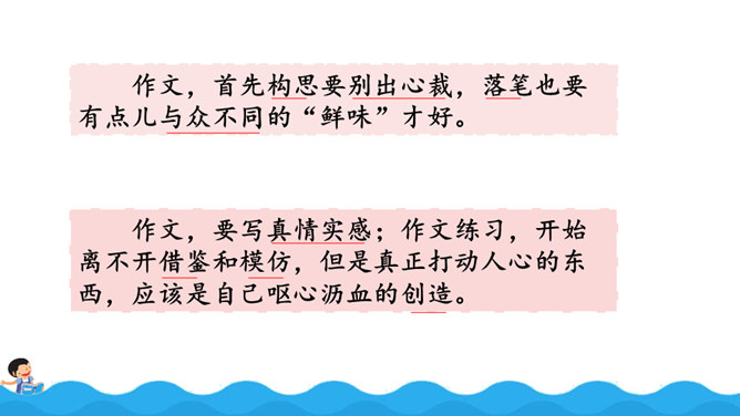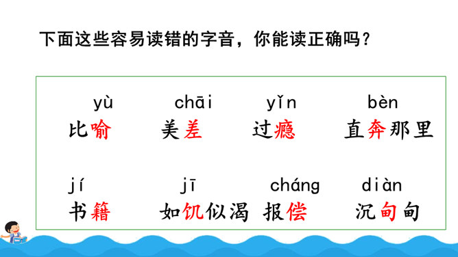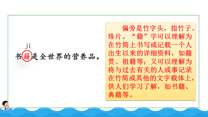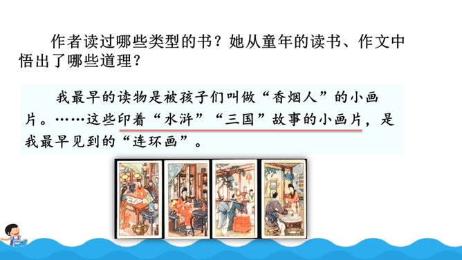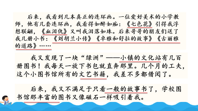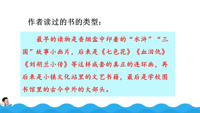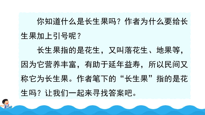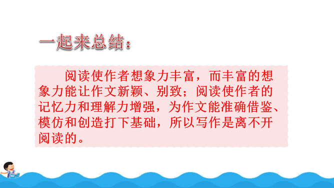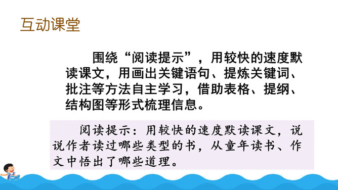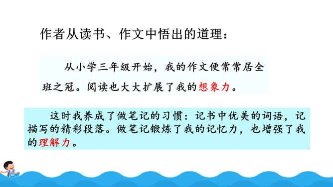 阅读使作者想象力丰富,而丰富的想象力能让作文新颖、别致;阅读使作者的记忆力和理解力增强,为作文能准确借鉴、模仿和创造打下基础,所以写作是离不开阅读的。围绕“阅读提示”,用较快的速度默读课文,用画出关键语句、提炼关键词、批注等方法自主学习,借助表格、提纲、结构图等形式梳理信息。自由朗读课文,读准本课生字的字音,不熟悉的词语和句子要多读几遍,争取把课文读通顺。所属专题:我的长生果ppt。