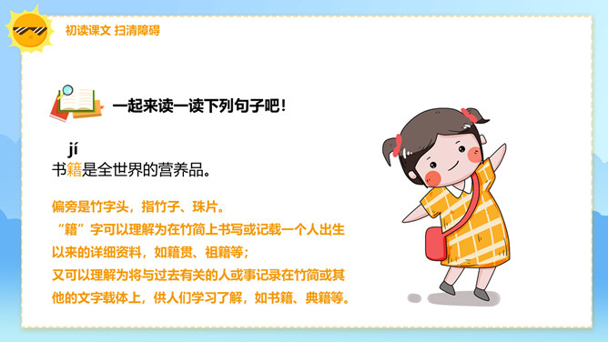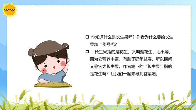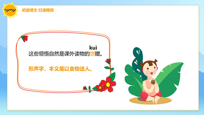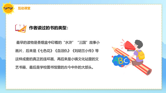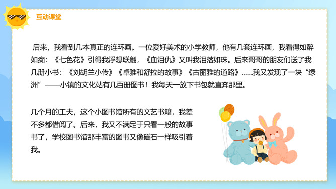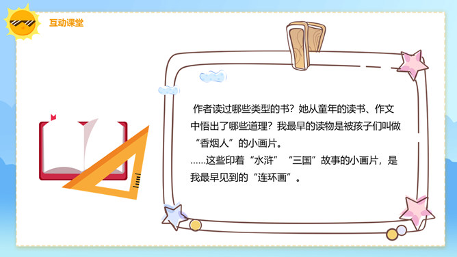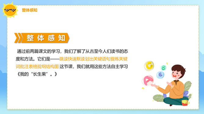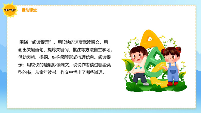 通过前两篇课文的学习,我们了解了从古至今人们读书的态度和方法。它们是——跳读快速默读划出关键语句提炼关键词批注表格提纲结构图 这节课,我们就用这些方法自主学习。围绕“阅读提示”,用较快的速度默读课文,用画出关键语句、提炼关键词、批注等方法自主学习,借助表格、提纲、结构图等形式梳理信息。阅读提示:用较快的速度默读课文,说说作者读过哪些类型的书,从童年读书、作文中悟出了哪些道理。所属专题:我的长生果ppt。