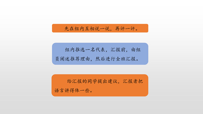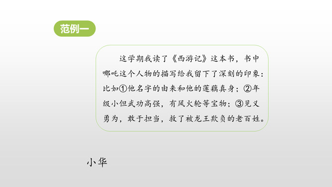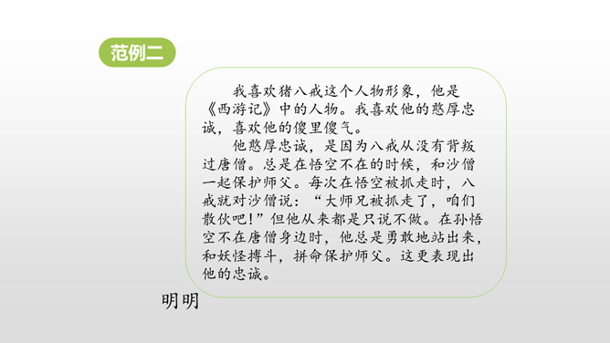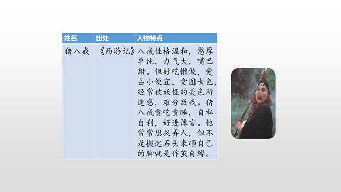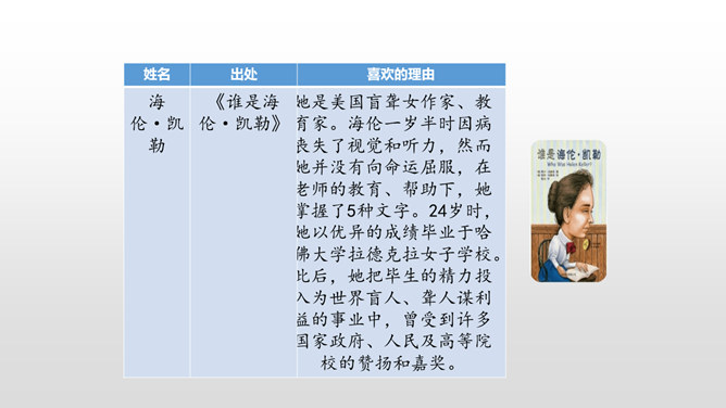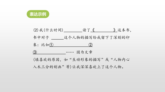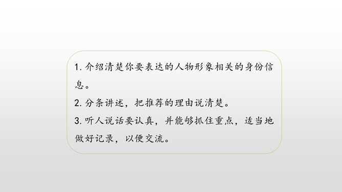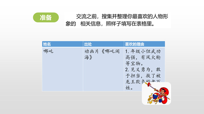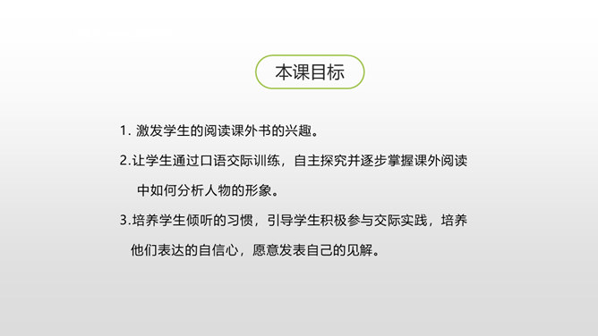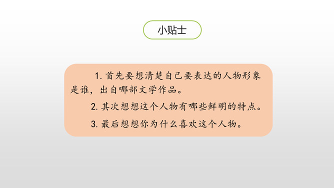 1. 激发学生的阅读课外书的兴趣。 2.让学生通过口语交际训练,自主探究并逐步掌握课外阅读中如何分析人物的形象。3.培养学生倾听的习惯,引导学生积极参与交际实践,培养他们表达的自信心,愿意发表自己的见解。喜欢上一本书,或许是因为它精彩的故事情节,或许是因为它深刻的道理,更或许是因为它塑造出来的一个个鲜活的人物形象令我们难忘。首先要想清楚自己要表达的人物形象是谁,出自哪部文学作品。所属专题:我最喜欢的人物形象ppt。