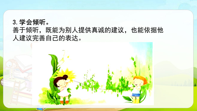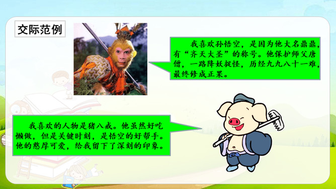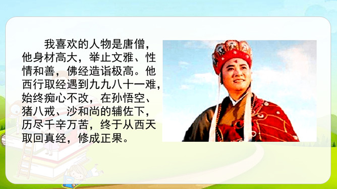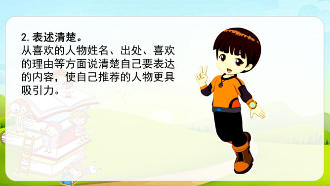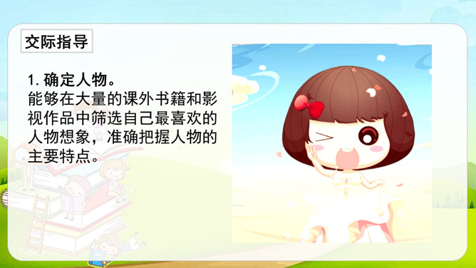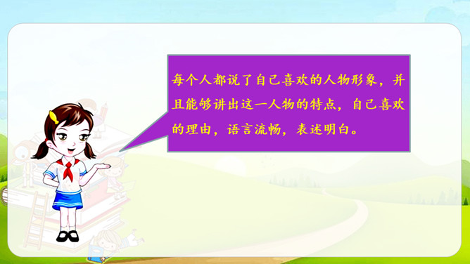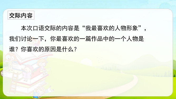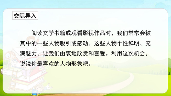 阅读文学书籍或观看影视作品时,我们常常会被其中的一些人物吸引或感动。这些人物个性鲜明、充满魅力,让我们由衷地欣赏和喜爱。利用这次机会,说说你最喜欢的人物形象吧。本次口语交际的内容是“我最喜欢的人物形象”,我们讨论一下,你最喜欢的一篇作品中的一个人物是谁?你喜欢的原因是什么?确定人物。能够在大量的课外书籍和影视作品中筛选自己最喜欢的人物想象,准确把握人物的主要特点。所属专题:我最喜欢的人物形象ppt。