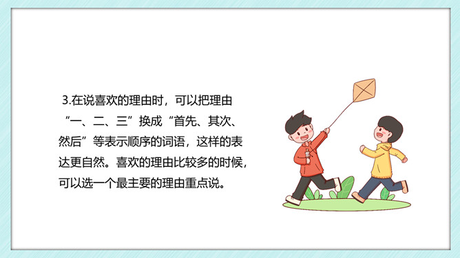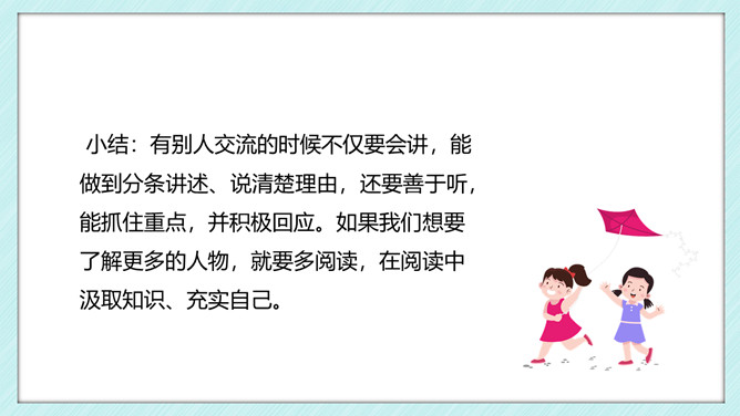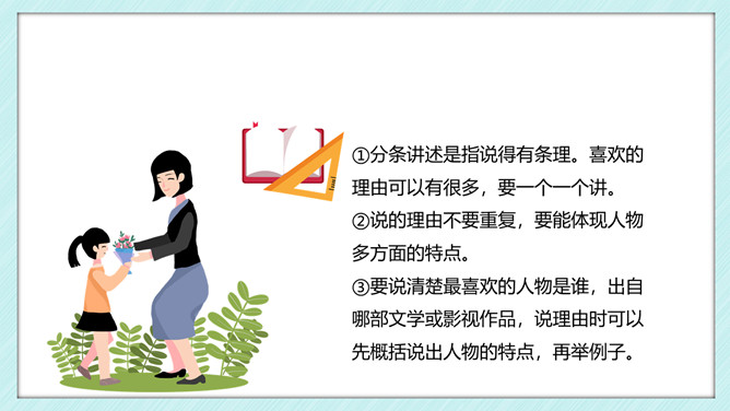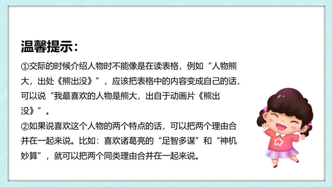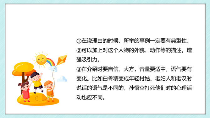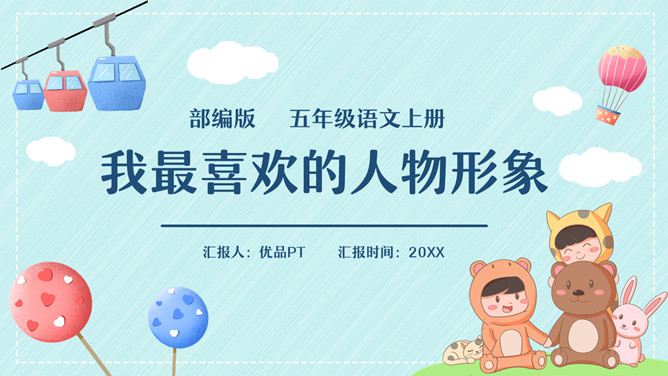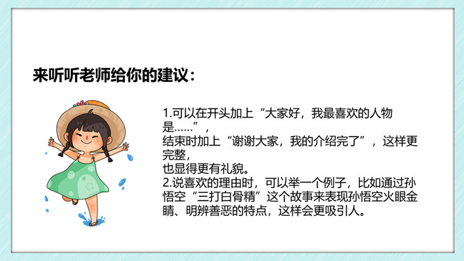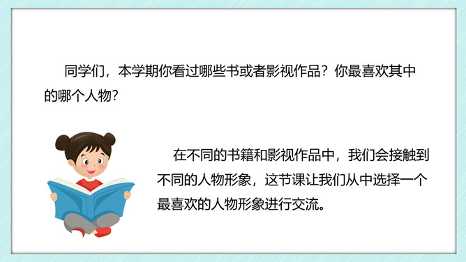 同学们,本学期你看过哪些书或者影视作品?你最喜欢其中的哪个人物?在不同的书籍和影视作品中,我们会接触到不同的人物形象,这节课让我们从中选择一个最喜欢的人物形象进行交流。①在说理由的时候,所举的事例一定要有典型性。②可以加上对这个人物的外貌、动作等的描述,增强吸引力。③在介绍时要自信、大方,音量要适中,语气要有变化。比如白骨精变成年轻村姑、老妇人和老汉时说话的语气是不同的,孙悟空打死他们时的心理活动也应不同。所属专题:我最喜欢的人物形象ppt。