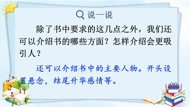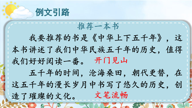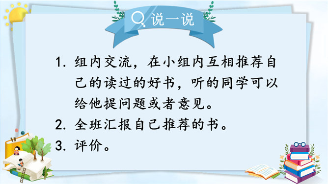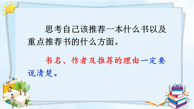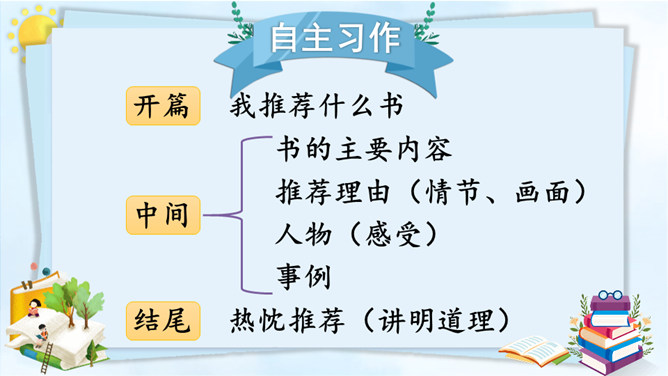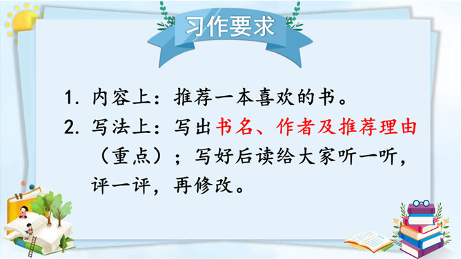 习作改完了,说说自己对所改的习作满意的地方在哪里,修改过程中最大的收获是什么。修改习作是写出一篇好作文的重要过程,因此同学们在创作后,一定要反复对习作进行修改。只有这样,写出来的习作才能成为精品。本次习作是推荐一本书,本单元的主题也是书,由此可见,书籍对我们来说十分重要。书籍是人类进步的阶梯。希望大家都能多读书、读好书,养成良好的阅读习惯。让我们和书成为朋友吧!所属专题:推荐一本书ppt。