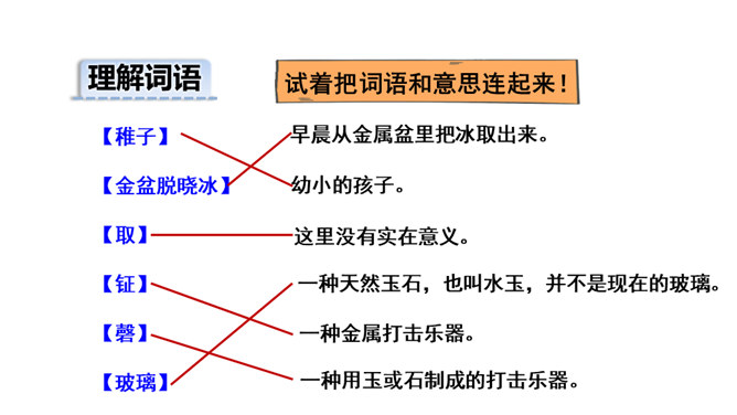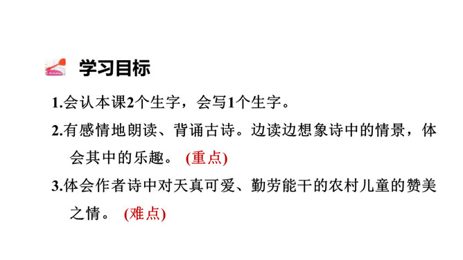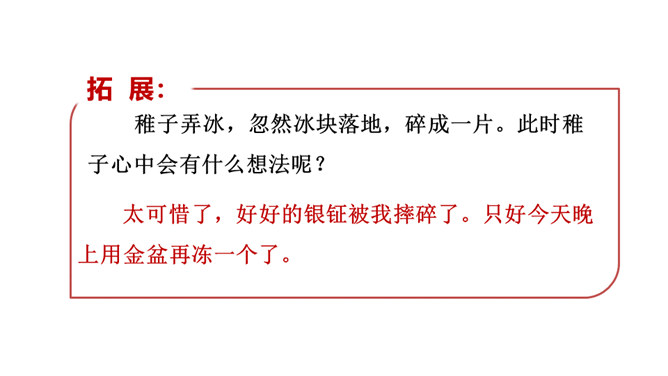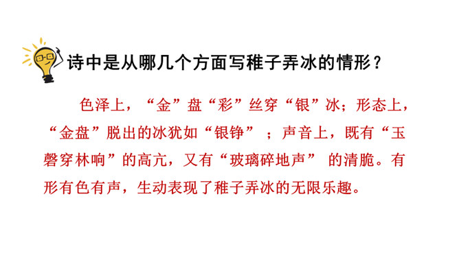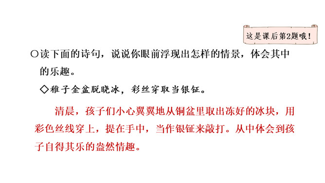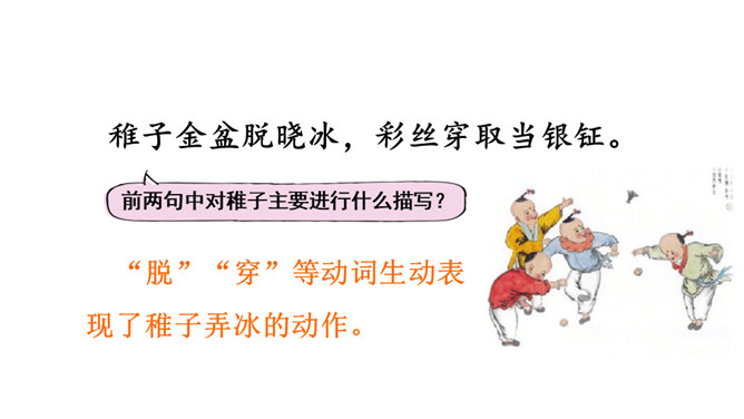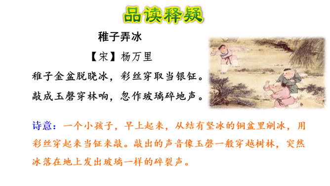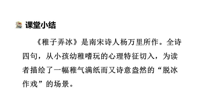 1.会认本课2个生字,会写1个生字。2.有感情地朗读、背诵古诗。边读边想象诗中的情景,体会其中的乐趣。 (重点)3.体会作者诗中对天真可爱、勤劳能干的农村儿童的赞美之情。 (难点)“脱”“穿”等动词生动表现了稚子弄冰的动作。读下面的诗句,说说你眼前浮现出怎样的情景,体会其中的乐趣。诗中是从哪几个方面写稚子弄冰的情形?稚子弄冰,忽然冰块落地,碎成一片。此时稚子心中会有什么想法呢?所属专题:稚子弄冰ppt。