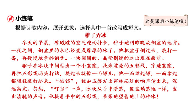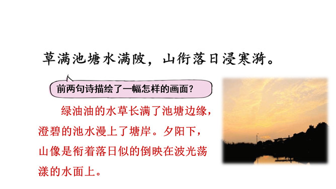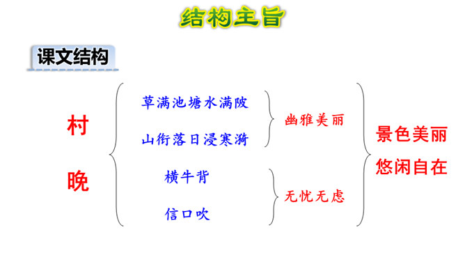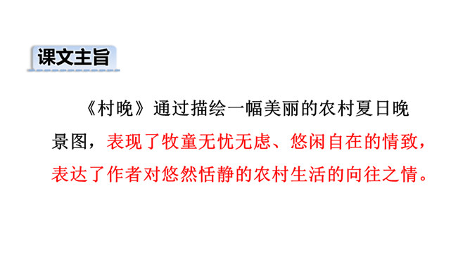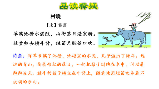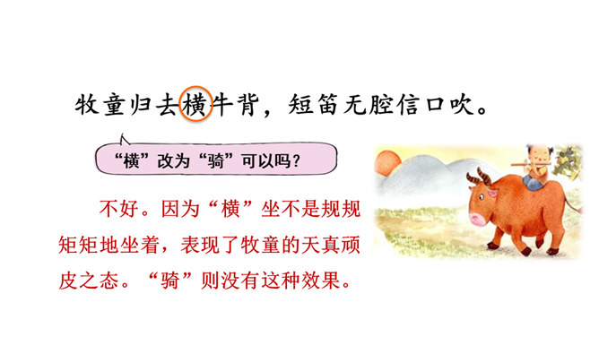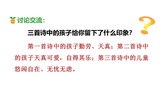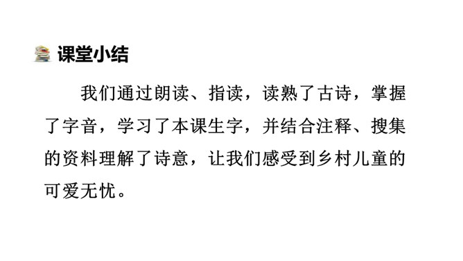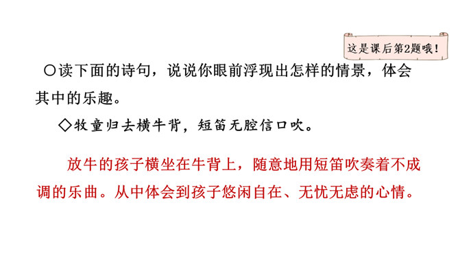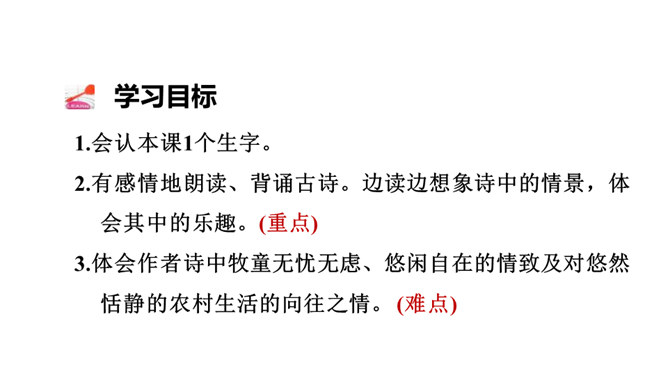 1.会认本课1个生字。2.有感情地朗读、背诵古诗。边读边想象诗中的情景,体会其中的乐趣。(重点)3.体会作者诗中牧童无忧无虑、悠闲自在的情致及对悠然恬静的农村生活的向往之情。 (难点)读下面的诗句,说说你眼前浮现出怎样的情景,体会其中的乐趣。三首诗中的孩子给你留下了什么印象?第一首诗中的孩子勤劳、天真;第二首诗中的孩子天真可爱,自得其乐;第三首诗中的儿童悠闲自在、无忧无虑。