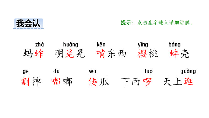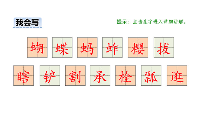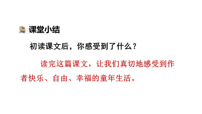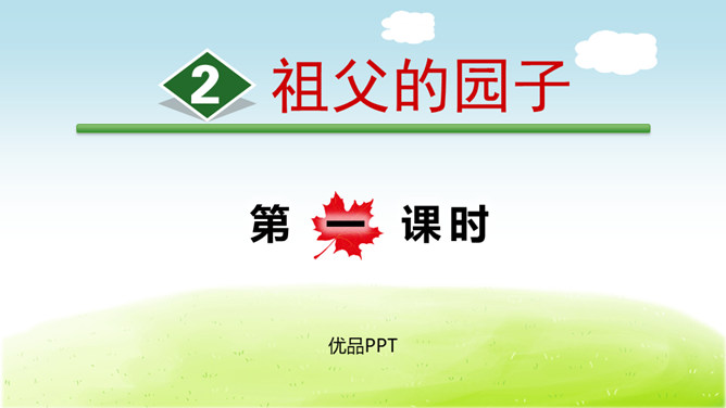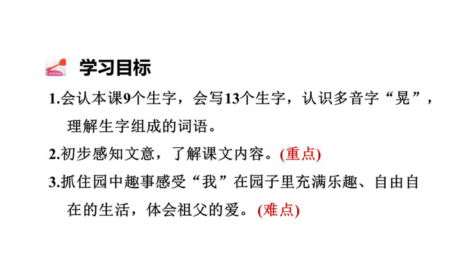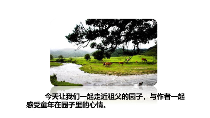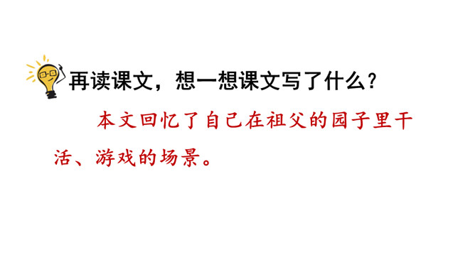 今天让我们一起走近祖父的园子,与作者一起感受童年在园子里的心情。1.会认本课9个生字,会写13个生字,认识多音字“晃”,理解生字组成的词语。2.初步感知文意,了解课文内容。(重点)3.抓住园中趣事感受“我”在园子里充满乐趣、自由自在的生活,体会祖父的爱。 (难点)再读课文,想一想课文写了什么?本文回忆了自己在祖父的园子里干活、游戏的场景。读完这篇课文,让我们真切地感受到作者快乐、自由、幸福的童年生活。所属专题:祖父的园子ppt。