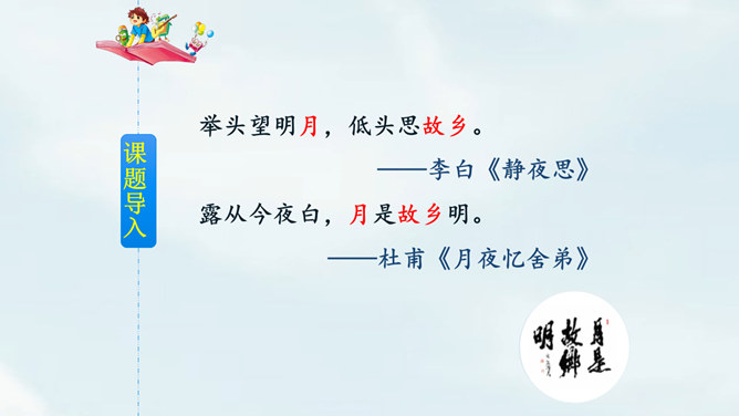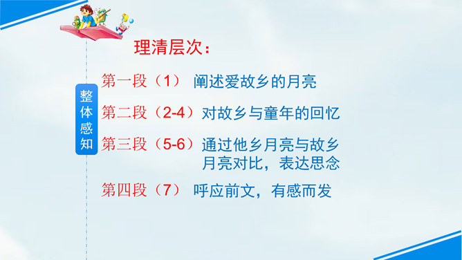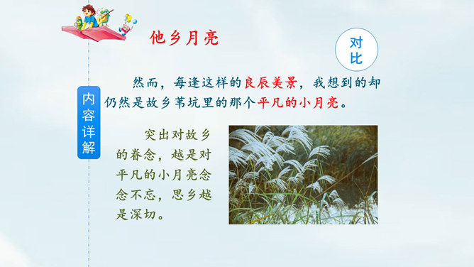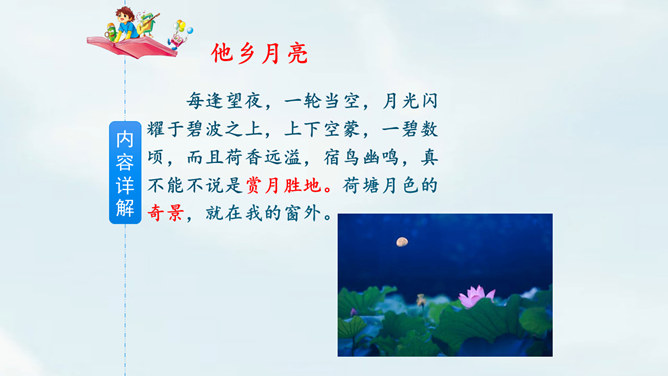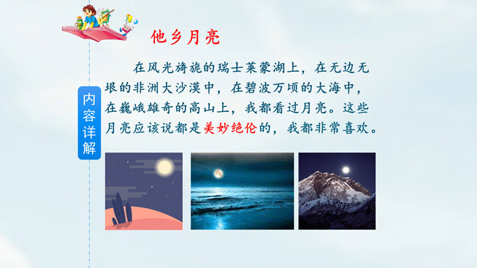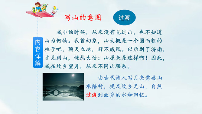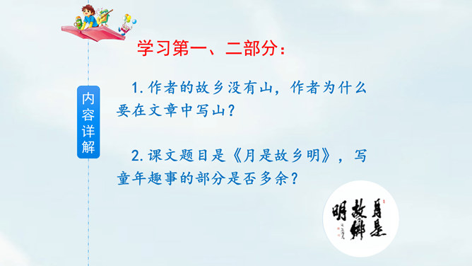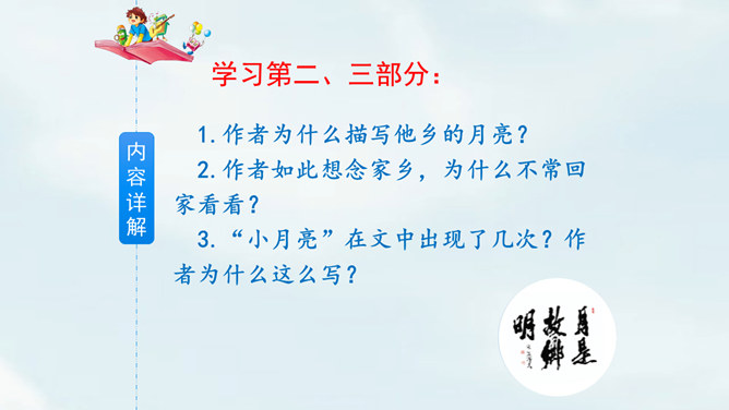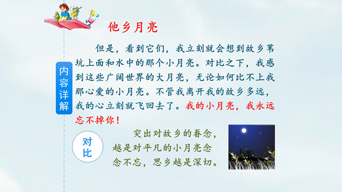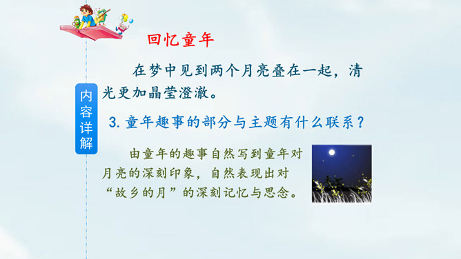 这篇课文的主要内容是什么?你怎样划分这篇课文的层次?作者的故乡没有山,作者为什么要在文章中写山?由童年的趣事自然写到童年对月亮的深刻印象,自然表现出对“故乡的月”的深刻记忆与思念。1.作者为什么描写他乡的月亮?2.作者如此想念家乡,为什么不常回家看看?3.“小月亮”在文中出现了几次?作者为什么这么写?本文以月亮作为抒情线索,通过对故乡和自己童年生活的回忆,对比他国他处的月亮,突出对故乡月亮的怀想,抒发了对故乡深深的思念之情。所属专题:月是故乡明ppt。
