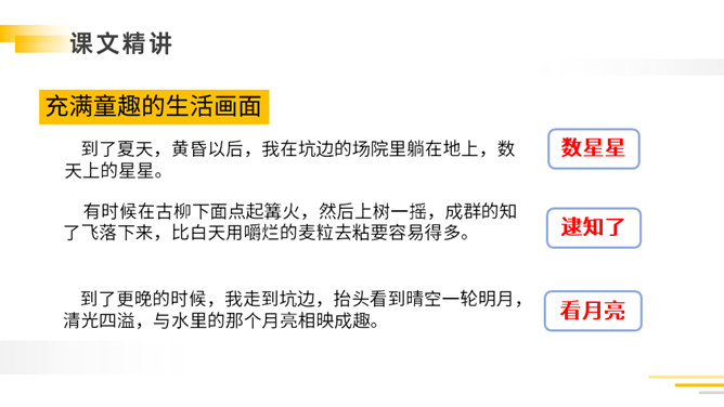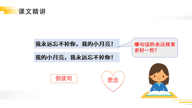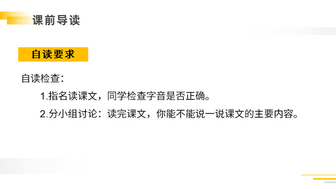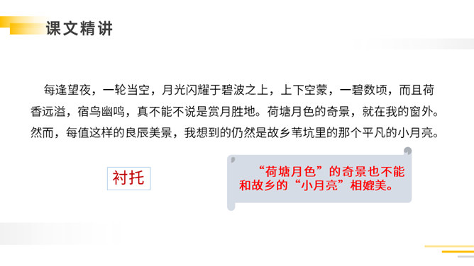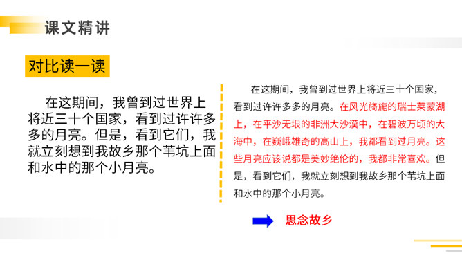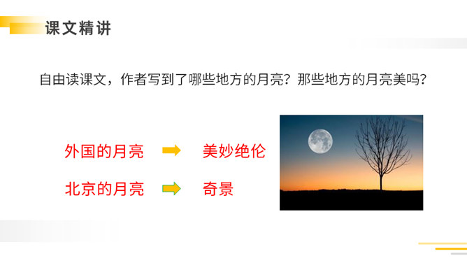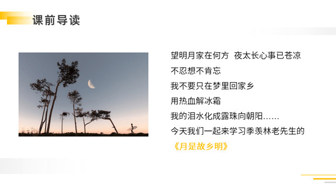 带着问题,有感情地朗读课文:①读准字音,把课文读正确,读通顺。②看看通过自学,能读懂什么?有不明白的,做上记号,提出来大家共同讨论。自读检查:1.指名读课文,同学检查字音是否正确。2.分小组讨论:读完课文,你能不能说一说课文的主要内容。以其特有的清新、自然的笔调向我们展现了故乡那温馨的夜晚,那恬淡的明月,童话般美妙的童年,给人一种亲切的感受,使我们感受到了作者那深切的思乡之情。所属专题:月是故乡明ppt。