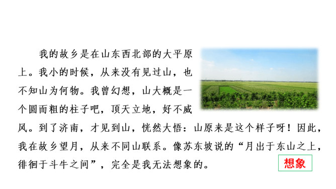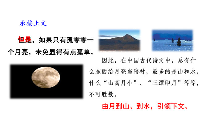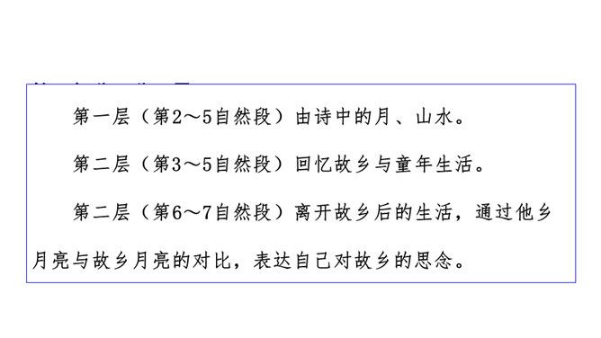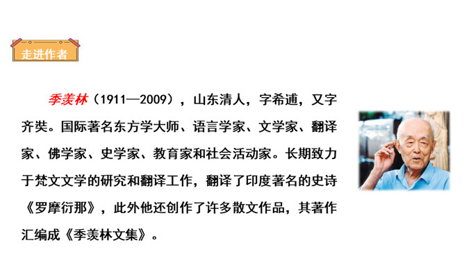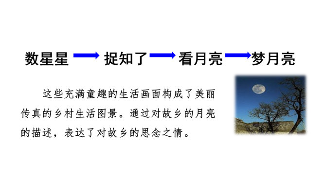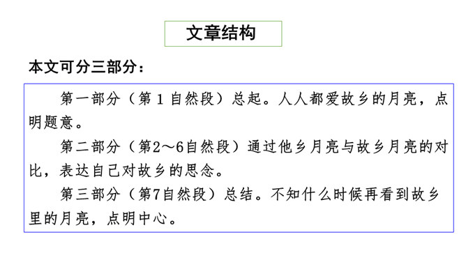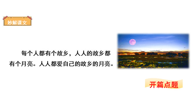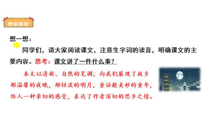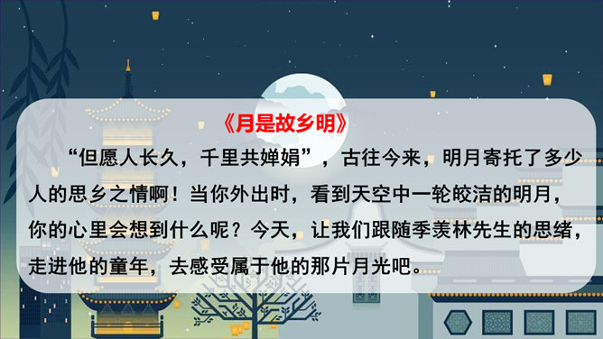 “但愿人长久,千里共婵娟”,古往今来,明月寄托了多少人的思乡之情啊!当你外出时,看到天空中一轮皎洁的明月,你的心里会想到什么呢?今天,让我们跟随季羡林先生的思绪,走进他的童年,去感受属于他的那片月光吧。同学们,请大家阅读课文,注意生字词的读音,明确课文的主要内容。思考:课文讲了一件什么事? 本文以清新、自然的笔调,向我们展现了故乡那温馨的夜晚,那恬淡的明月,童话般美妙的童年,给人一种亲切的感受,表达了作者深切的思乡之情。所属专题:月是故乡明ppt。