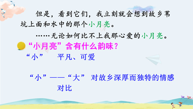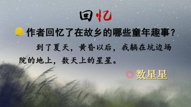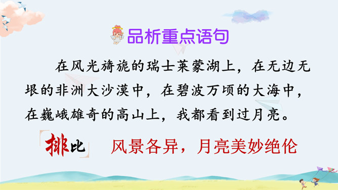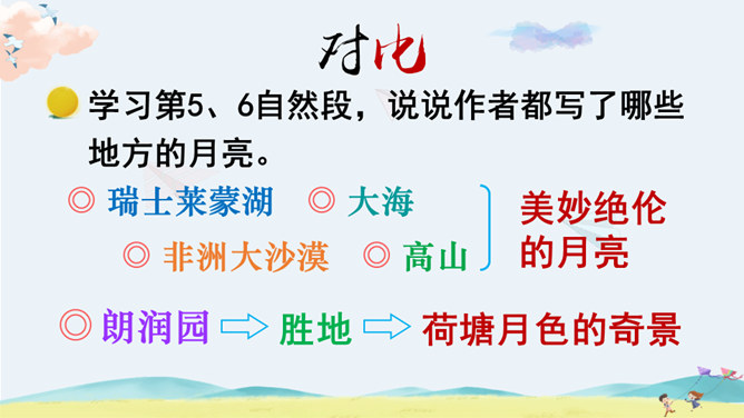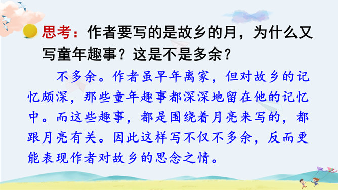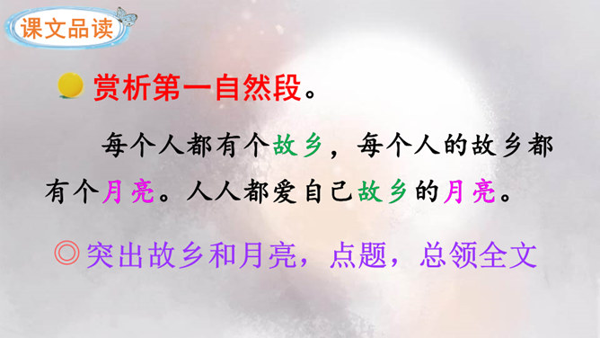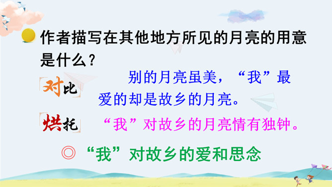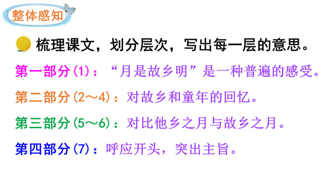 梳理课文,划分层次,写出每一层的意思。第一部分(1):“月是故乡明”是一种普遍的感受。第二部分(2~4):对故乡和童年的回忆。第三部分(5~6):对比他乡之月与故乡之月。第四部分(7):呼应开头,突出主旨。思考:作者要写的是故乡的月,为什么又写童年趣事?这是不是多余?不多余。作者虽早年离家,但对故乡的记忆颇深,那些童年趣事都深深地留在他的记忆中。而这些趣事,都是围绕着月亮来写的,都跟月亮有关。所属专题:月是故乡明ppt。