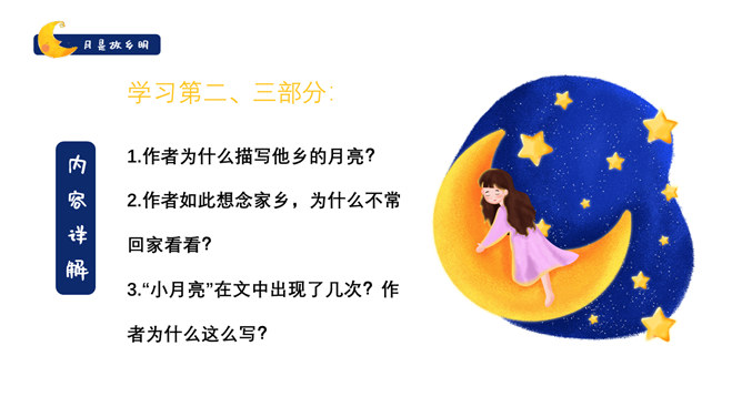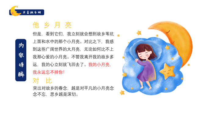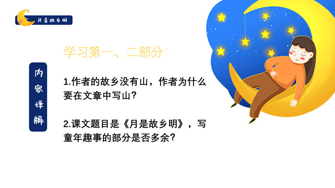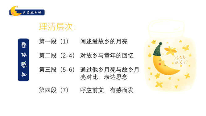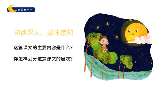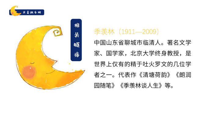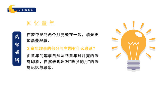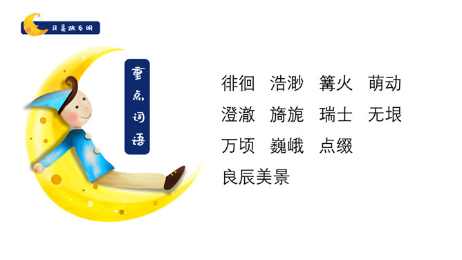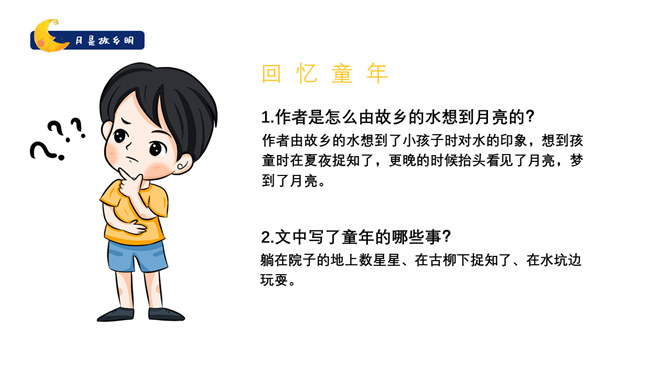 作者是怎么由故乡的水想到月亮的?作者由故乡的水想到了小孩子时对水的印象,想到孩童时在夏夜捉知了,更晚的时候抬头看见了月亮,梦到了月亮。文中写了童年的哪些事?躺在院子的地上数星星、在古柳下捉知了、在水坑边玩耍。在梦中见到两个月亮叠在一起,清光更加晶莹澄澈。童年趣事的部分与主题有什么联系?由童年的趣事自然写到童年对月亮的深刻印象,自然表现出对“故乡的月”的深刻记忆与思念。所属专题:月是故乡明ppt。