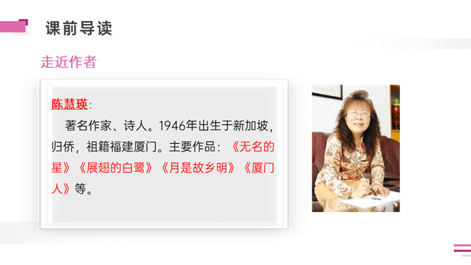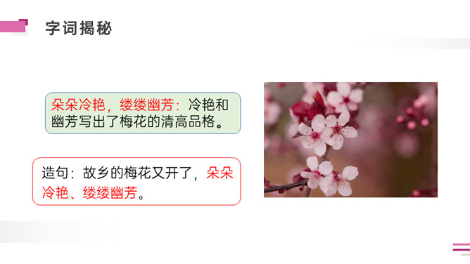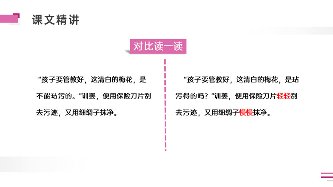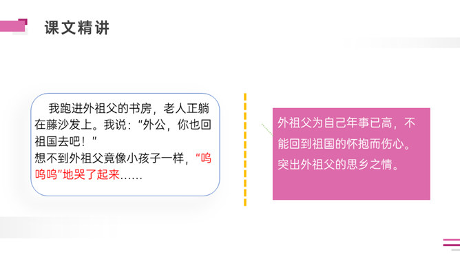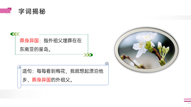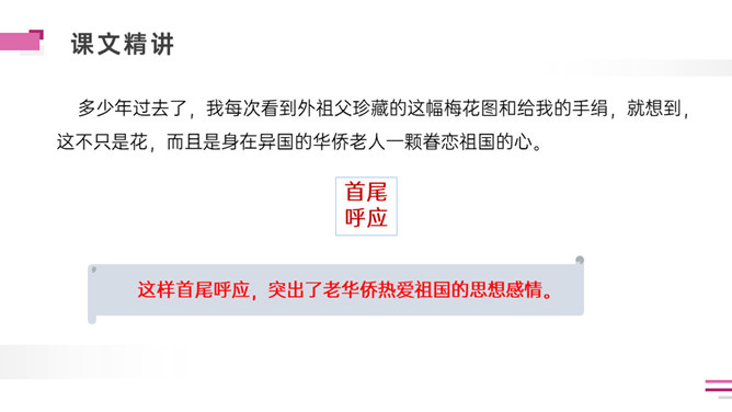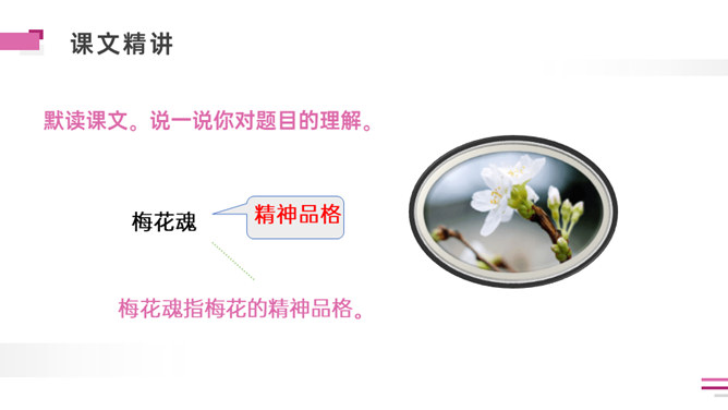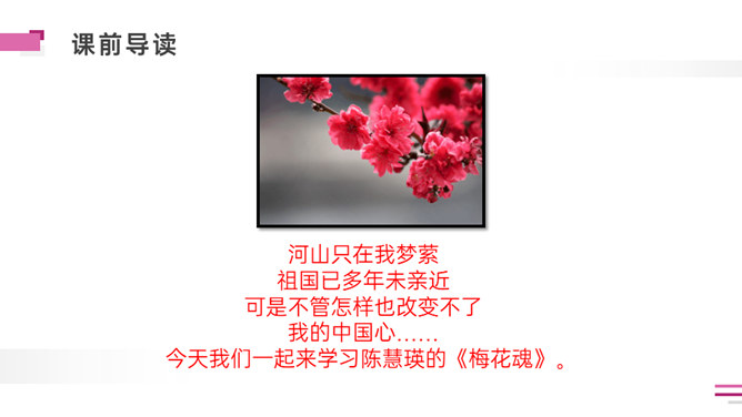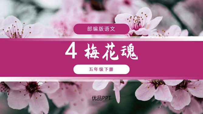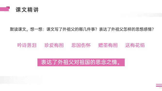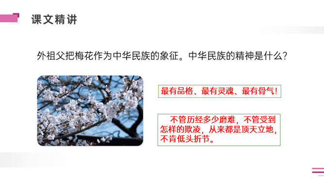 默读课文。想一想:课文写了外祖父的哪几件事?表达了外祖父怎样的思想感情?外祖父为什么要保存这幅梅花图?是因为外祖父对家乡的思念之情,以梅花托物言志。可以看出对梅花和祖国的热爱与思念之情。外祖父为自己年事已高,不能回到祖国的怀抱而伤心。突出外祖父的思乡之情。外祖父把梅花作为中华民族的象征。中华民族的精神是什么?“梅花魂”的内涵是:保持梅花的品格,保持中国人的气节。以“梅花魂”为题点明了文章的中心。所属专题:梅花魂ppt。