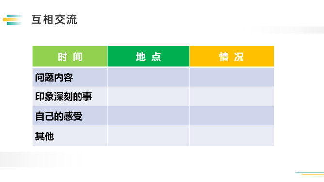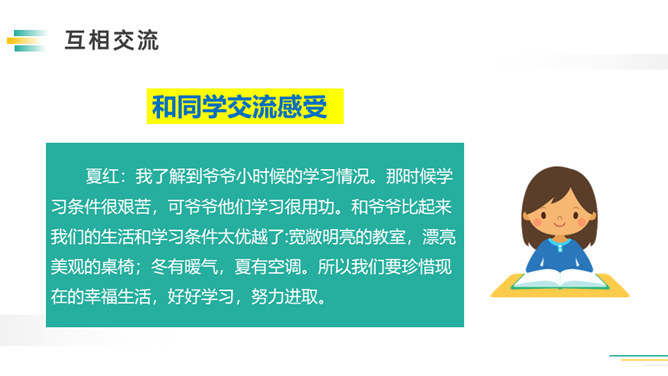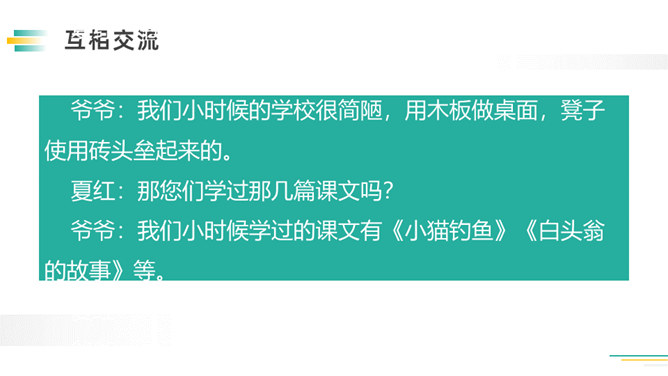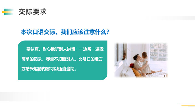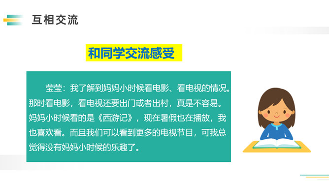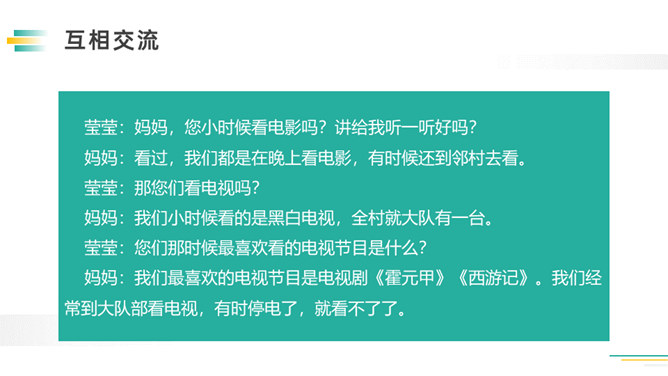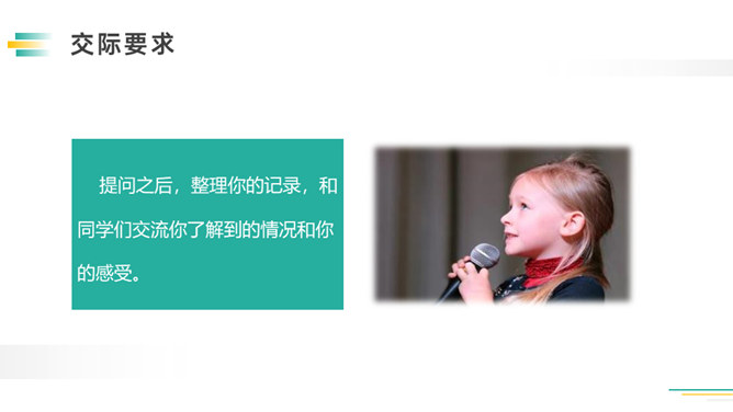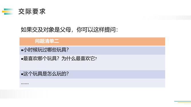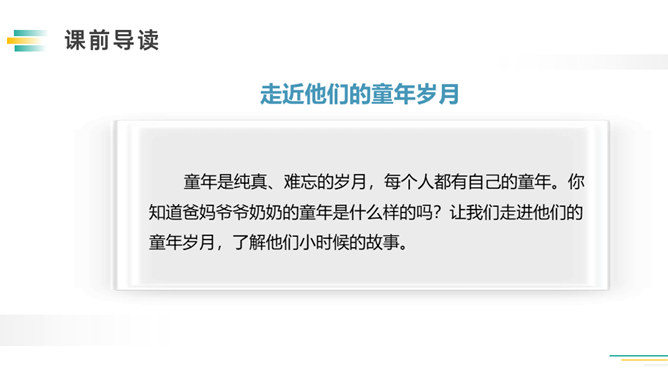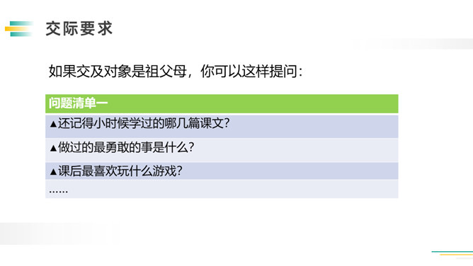 先想一想可以了解谁的童年,如祖父母、父母、邻居,在针对不同的对象,列出问题清单。可以从不同方面提问,也可以围绕一个话题提出多个问题。想要了解别人的故事,就必须先了解与人交流和倾听故事的技巧。作为小记者的同时,不要忘记你也是一名倾听者。大家今天回家之后,去采访一下你的爷爷奶奶或者家里其他长辈吧!记得记录下来,与大家分享。利用课余时间,和自己周围的人进行交流,了解更多人的童年生活。所属专题:走进他们的童年岁月ppt。