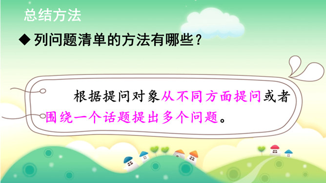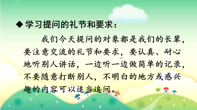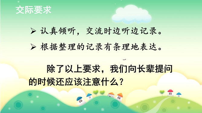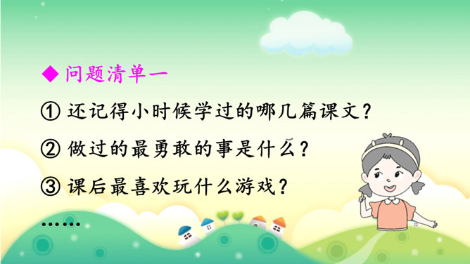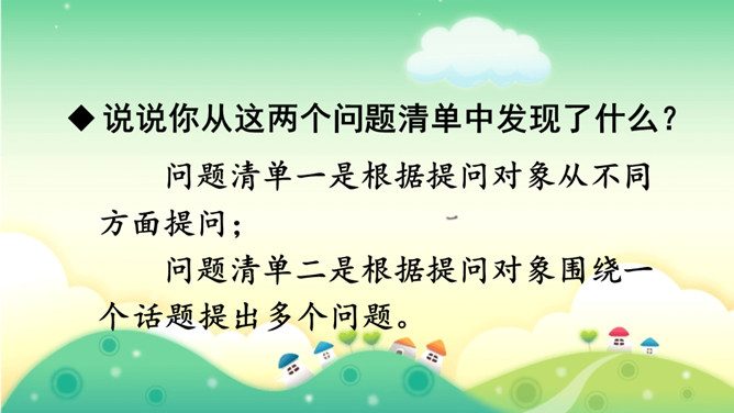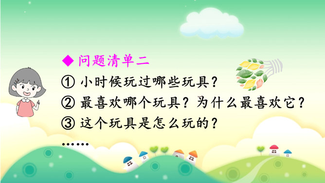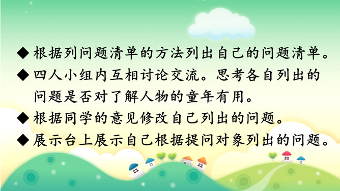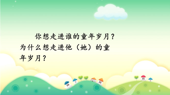 你想走进谁的童年岁月?为什么想走进他(她)的童年岁月?列出问题清单:先确定好提问对象,再根据提问对象提出恰当的问题。问题清单一:还记得小时候学过的哪几篇课文?做过的最勇敢的事是什么?课后最喜欢玩什么游戏?问题清单二:小时候玩过哪些玩具?最喜欢哪个玩具?为什么最喜欢它?这个玩具是怎么玩的?说说你从这两个问题清单中发现了什么?问题清单一是根据提问对象从不同方面提问;问题清单二是根据提问对象围绕一个话题提出多个问题。所属专题:走进他们的童年岁月ppt。