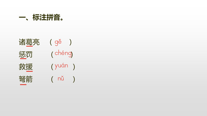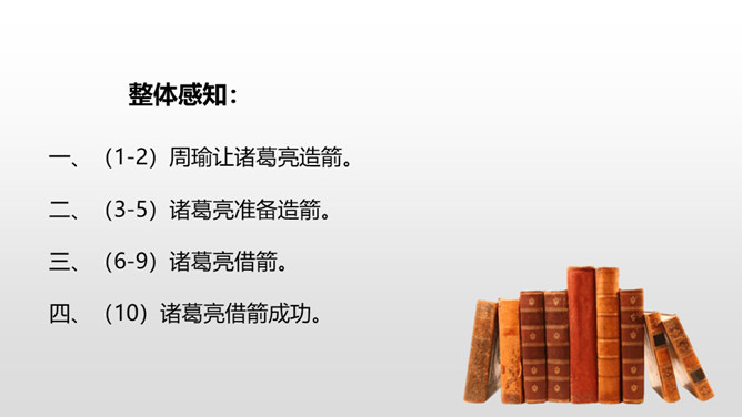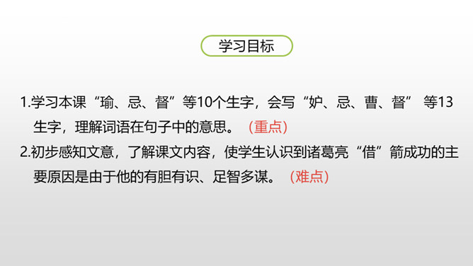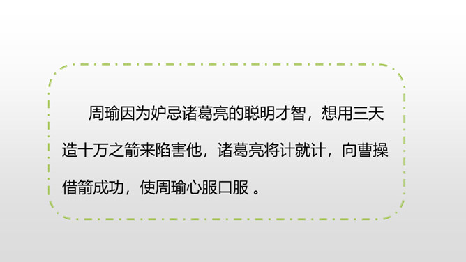 1.学习本课“瑜、忌、督”等10个生字,会写“妒、忌、曹、督” 等13生字,理解词语在句子中的意思。(重点)2.初步感知文意,了解课文内容,使学生认识到诸葛亮“借”箭成功的主要原因是由于他的有胆有识、足智多谋。(难点)同学们,大家读过《三国演义》吗?都能说出其中的哪些故事呀?认真读,圈出本课新词语,再思考:课文主要向我们介绍了什么?通读全文,说说文章的主要层次是什么。所属专题:草船借箭ppt。