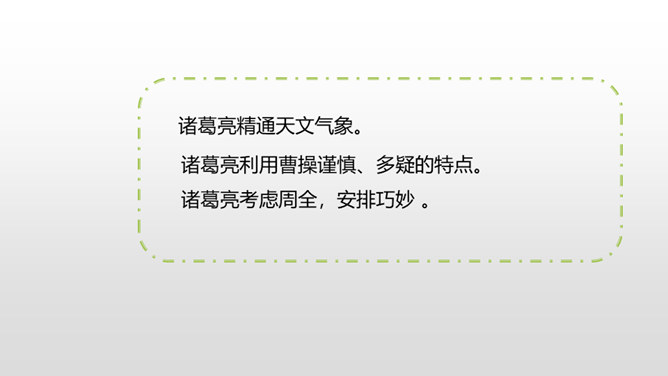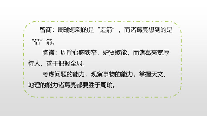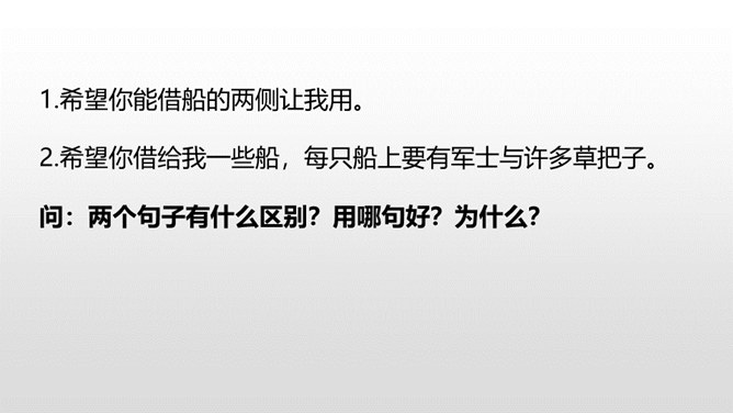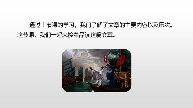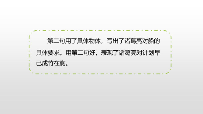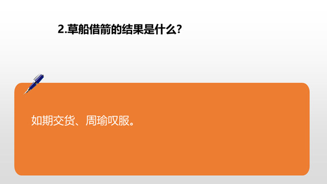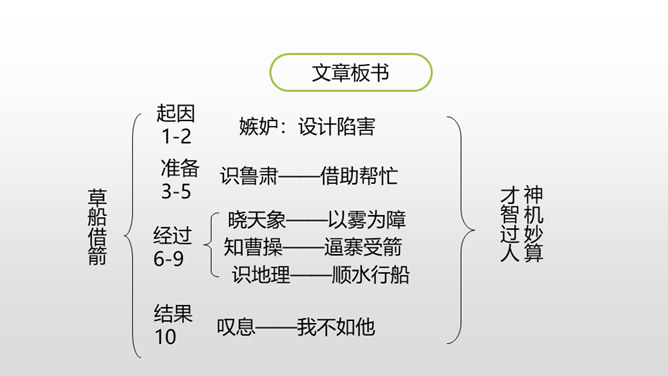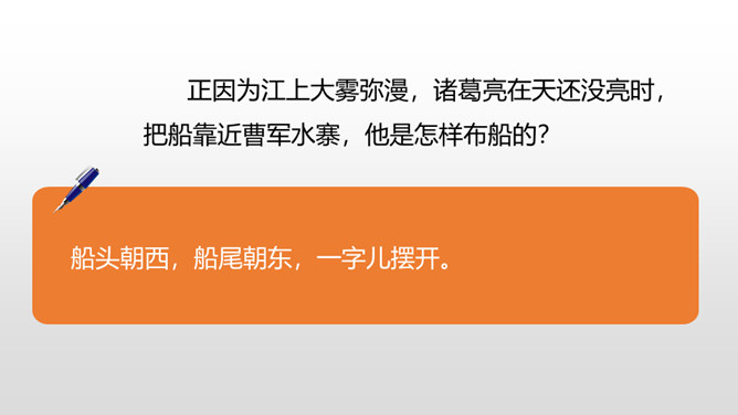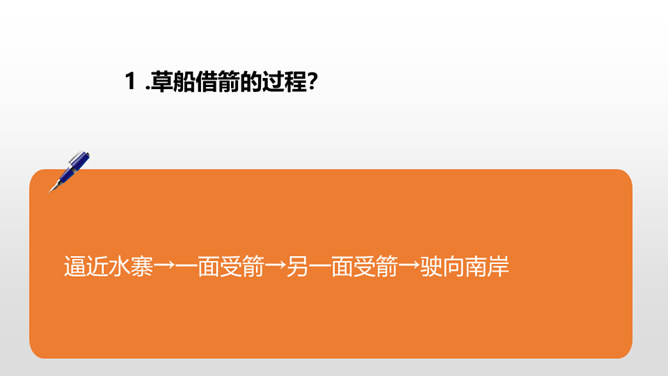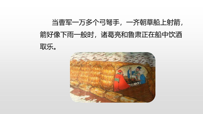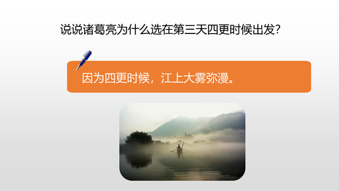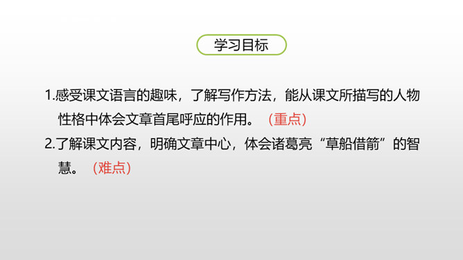 1.感受课文语言的趣味,了解写作方法,能从课文所描写的人物性格中体会文章首尾呼应的作用。(重点)2.了解课文内容,明确文章中心,体会诸葛亮“草船借箭”的智慧。(难点)通过上节课的学习,我们了解了文章的主要内容以及层次。这节课,我们一起来接着品读这篇文章。默读课文2-4段,找找突出描写诸葛亮神机妙算、胸有成竹、料事如神的句子,用“—”画下。说说诸葛亮为什么选在第三天四更时候出发?所属专题:草船借箭ppt。