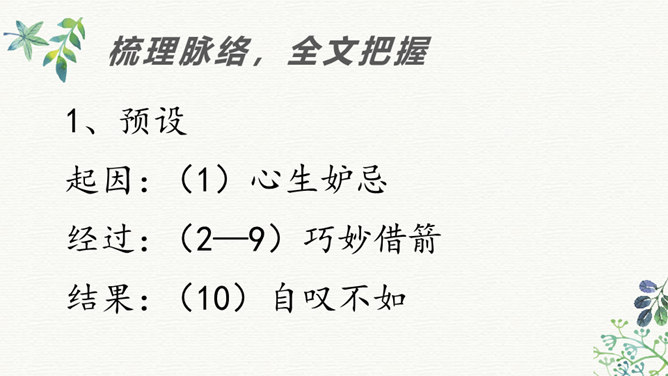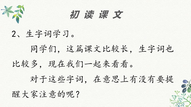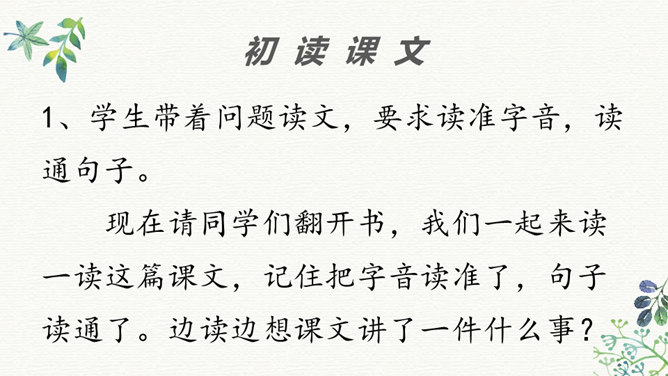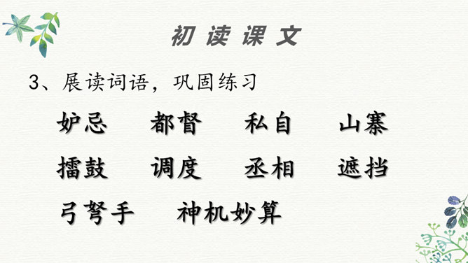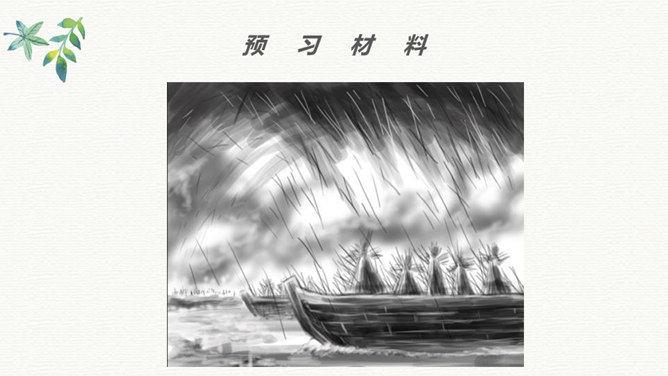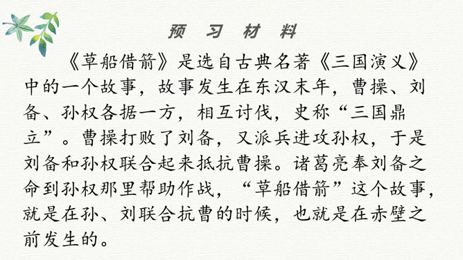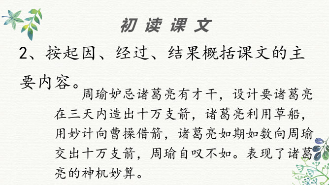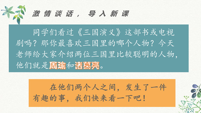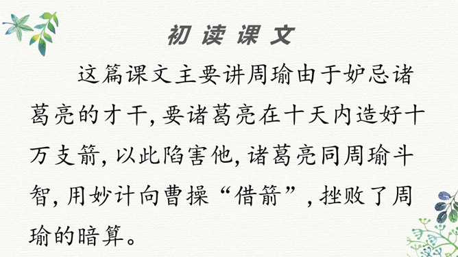 同学们看过《三国演义》这部书或电视剧吗?那你最喜欢三国里的哪个人物?今天老师给大家介绍两位三国里比较聪明的人物,他们就是周瑜和诸葛亮。在他们两个人之间,发生了一件有趣的事,我们快来看一下吧!学生带着问题读文,要求读准字音,读通句子。现在请同学们翻开书,我们一起来读一读这篇课文,记住把字音读准了,句子读通了。边读边想课文讲了一件什么事?同学们,这篇课文比较长,生字词也比较多,现在我们一起来看看。所属专题:草船借箭ppt。
