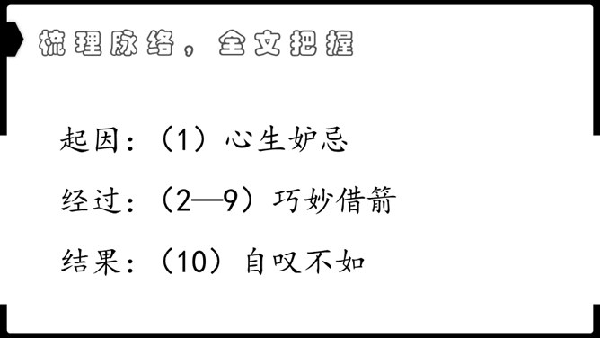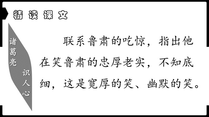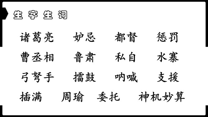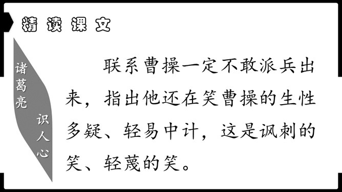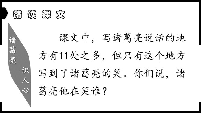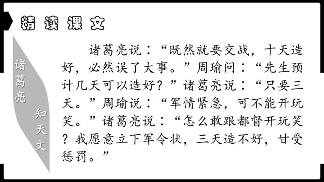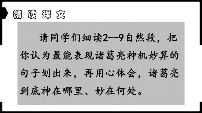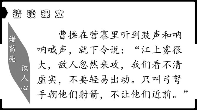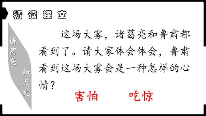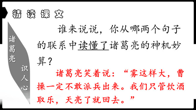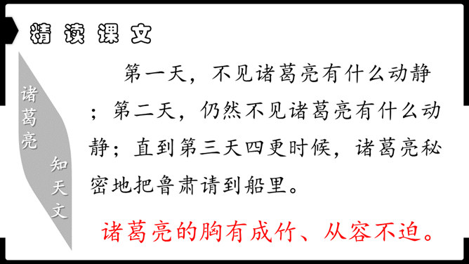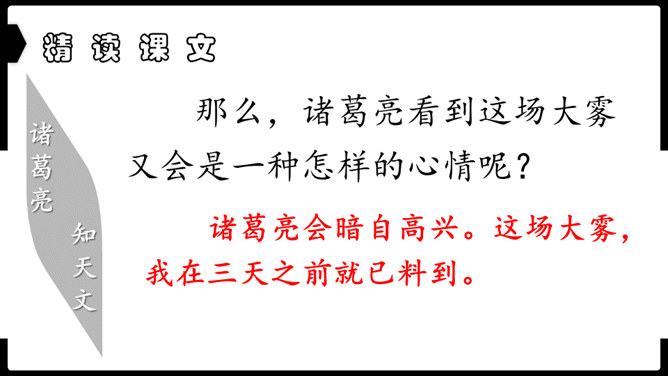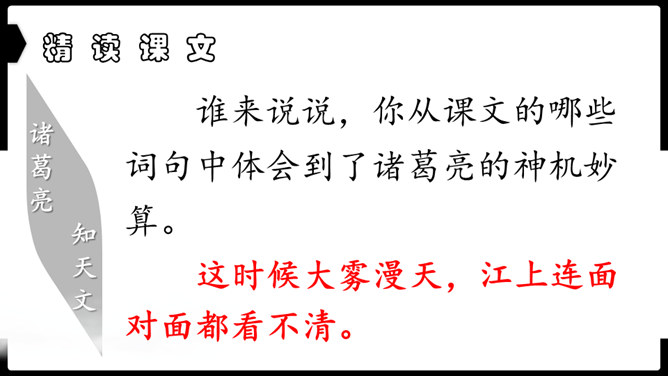 请同学们细读2--9自然段,把你认为最能表现诸葛亮神机妙算的句子划出来,再用心体会,诸葛亮到底神在哪里、妙在何处。谁来说说,你从课文的哪些词句中体会到了诸葛亮的神机妙算。这场大雾,诸葛亮和鲁肃都看到了。请大家体会体会,鲁肃看到这场大雾会是一种怎样的心情?那么,诸葛亮看到这场大雾又会是一种怎样的心情呢?光读这句话,就能看出诸葛亮的神机妙算吗?不能!为什么?因为这场大雾也许是凑巧碰上的呢?所以,我们得再往前面读一读,联系上文看从哪一句话可以看出诸葛亮早在三天之前就已算准了这场大雾。所属专题:草船借箭ppt。