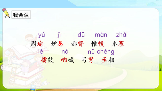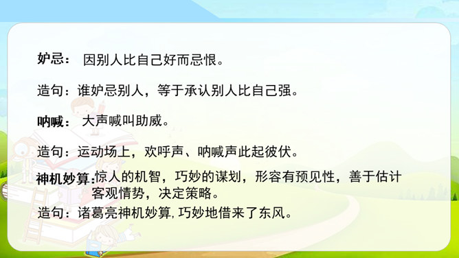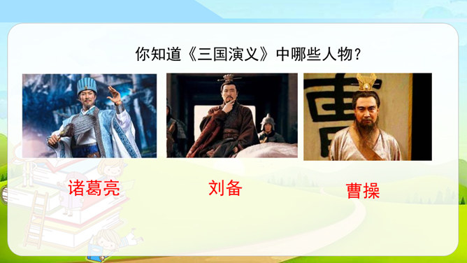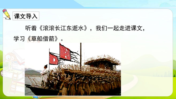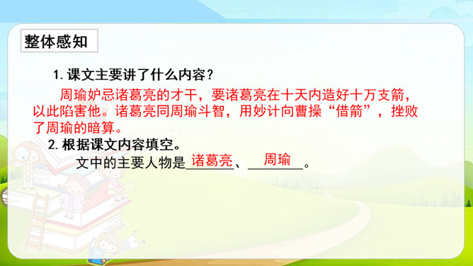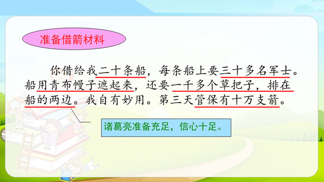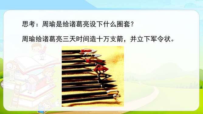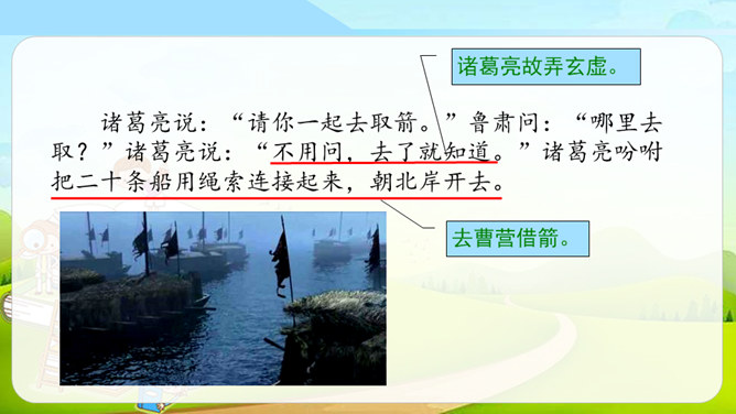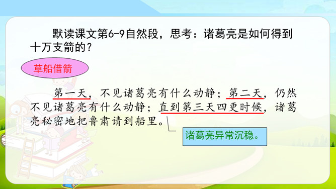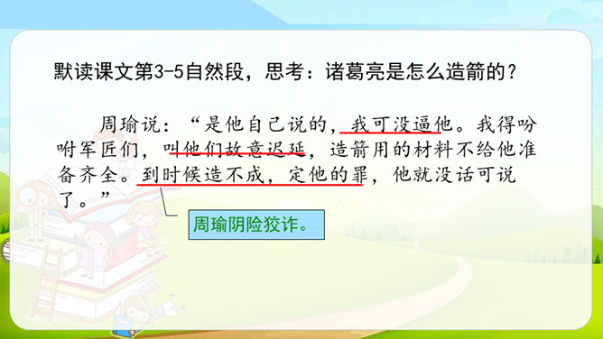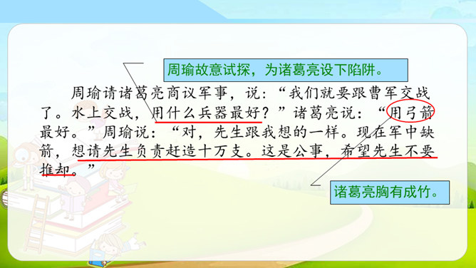 课文主要讲了什么内容?周瑜妒忌诸葛亮的才干,要诸葛亮在十天内造好十万支箭,以此陷害他。诸葛亮同周瑜斗智,用妙计向曹操“借箭”,挫败了周瑜的暗算。《三国演义》中还有好多关于诸葛亮的故事,找来和爸爸妈妈一起读一读吧,看看书中的诸葛亮到底是怎样的神机妙算。解析:1.默读课文时做到眼到、心到,不出声,不指读。2.读课文时,按事情发展的顺序理清文章的脉络,分别找出描写故事起因、经过结果的段落,再根据课文内容进行概括,简要说出故事的主要内容。所属专题:草船借箭ppt。