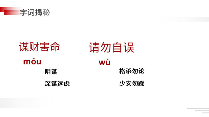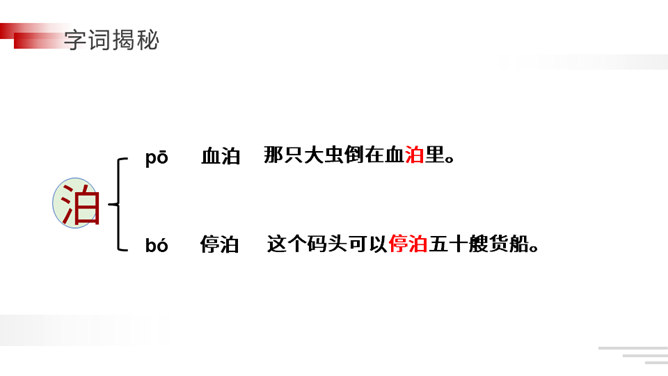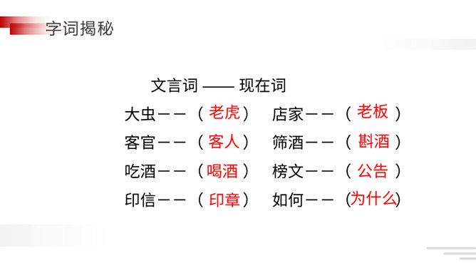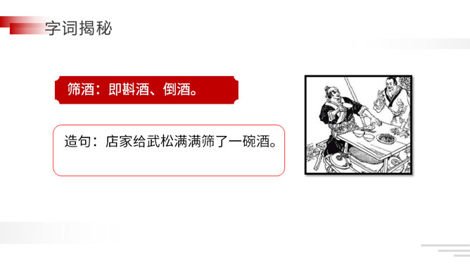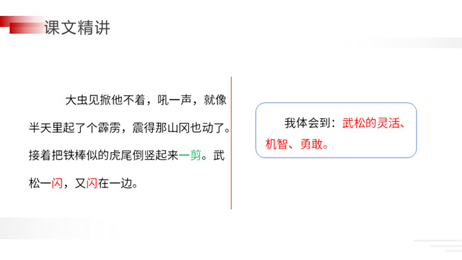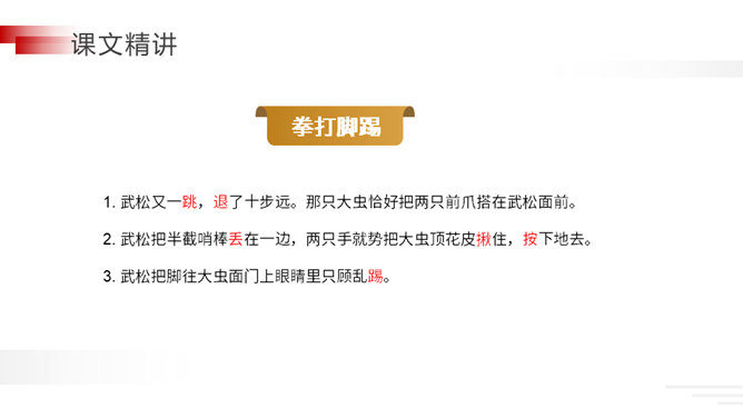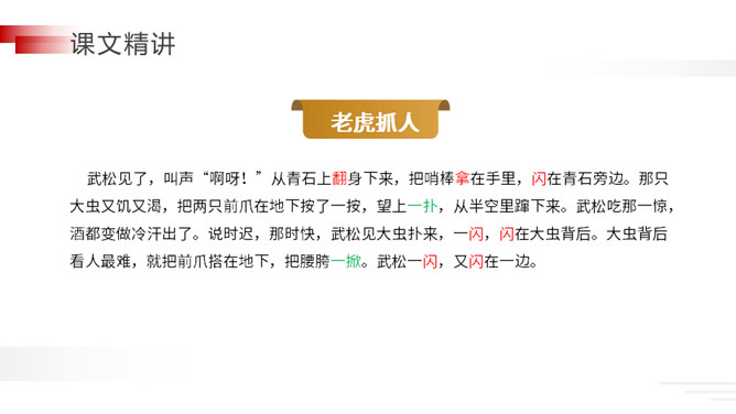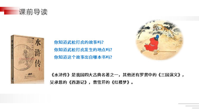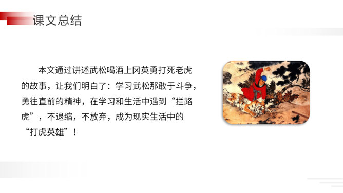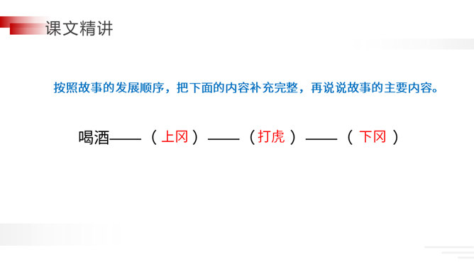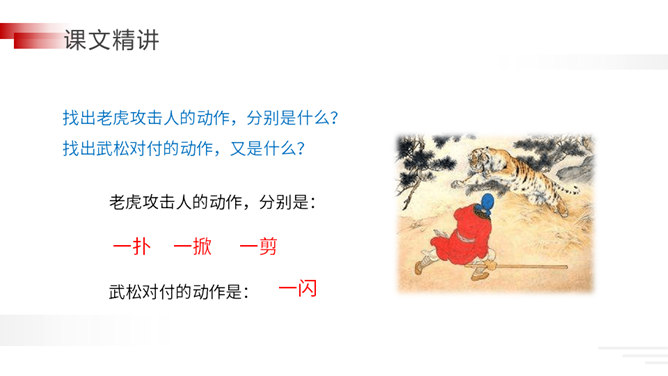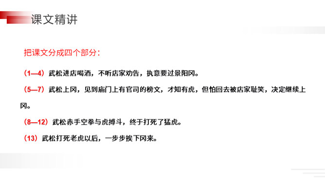 把课文分成四个部分:(1—4)武松进店喝酒,不听店家劝告,执意要过景阳冈。(5—7)武松上冈,见到庙门上有官司的榜文,才知有虎,但怕回去被店家耻笑,决定继续上冈。(8—12)武松赤手空拳与虎搏斗,终于打死了猛虎。(13)武松打死老虎以后,一步步挨下冈来。按照故事的发展顺序,把下面的内容补充完整,再说说故事的主要内容。找出老虎攻击人的动作,分别是什么?找出武松对付的动作,又是什么?所属专题:景阳冈ppt。