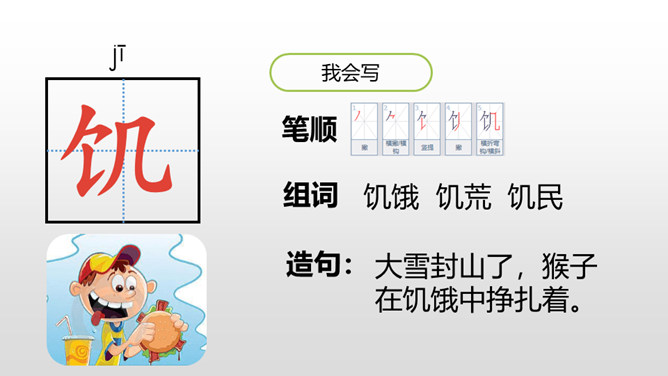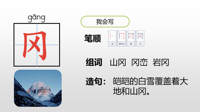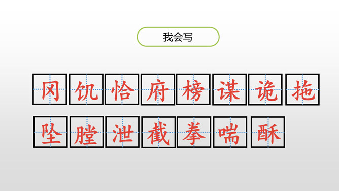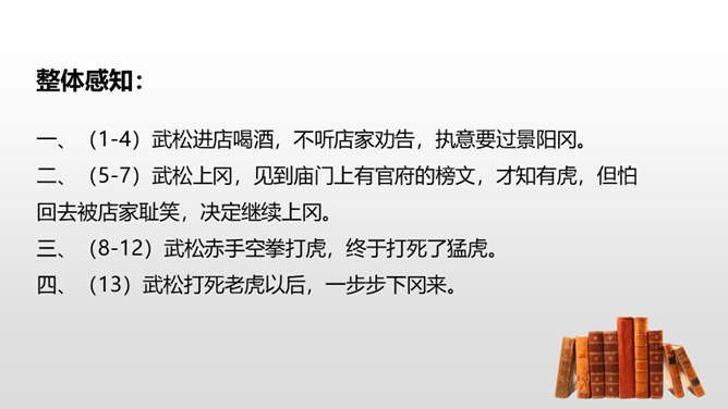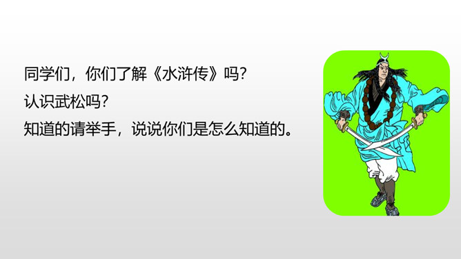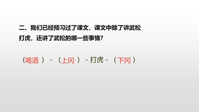 1.学习本课“筷、恰、谋”等18 个生字,会写“冈、饥、恰” 等15生字,理解词语在句子中的意思。(重点)2.初步感知文意,理解课文内容,了解武松打虎的经过。(难点)同学们,你们了解《水浒传》吗?认识武松吗?知道的请举手,说说你们是怎么知道的。认真读,圈出本课新词语,再思考:课文主要向我们介绍了什么?通读全文,说说文章的主要层次是什么。我们已经预习过了课文,课文中除了讲武松打虎,还讲了武松的哪一些事情?所属专题:景阳冈ppt。