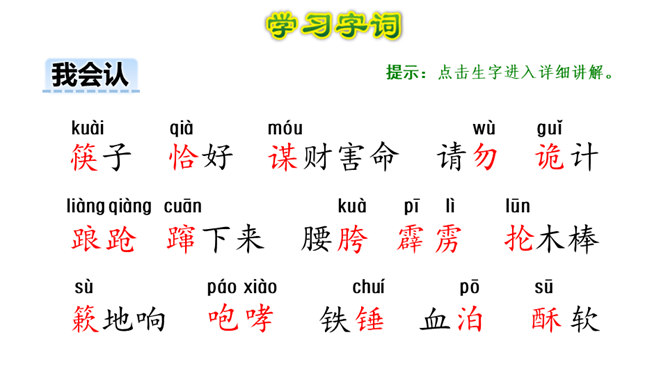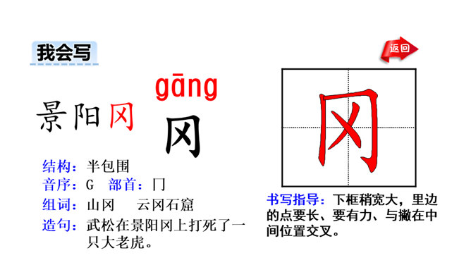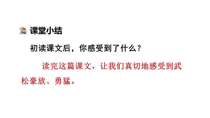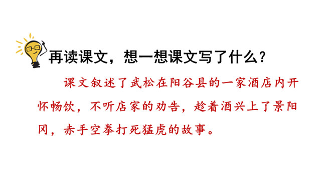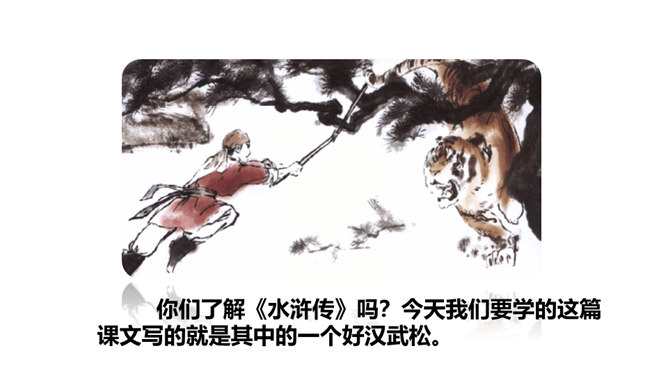 知道这首歌是哪部电视剧的主题歌吗?你们了解《水浒传》吗?今天我们要学的这篇课文写的就是其中的一个好汉武松。1.会认本课12个生字,会写15个生字,理解生字组成的词语。 (重点)2.朗读课文,能边读边想象课文描写的景观。 (重点)3.初步感知文意,了解课文内容。 (难点)课文叙述了武松在阳谷县的一家酒店内开怀畅饮,不听店家的劝告,趁着酒兴上了景阳冈,赤手空拳打死猛虎的故事。所属专题:景阳冈ppt。