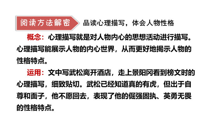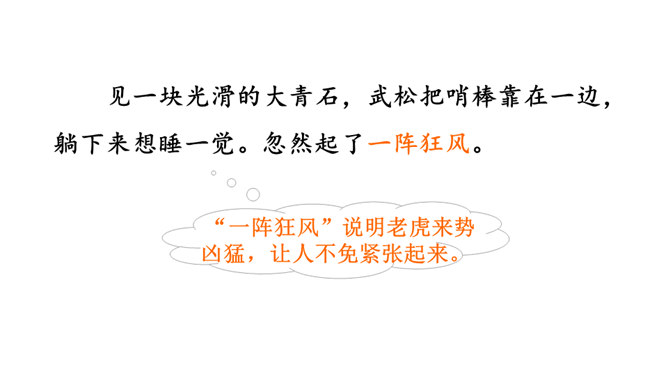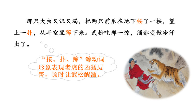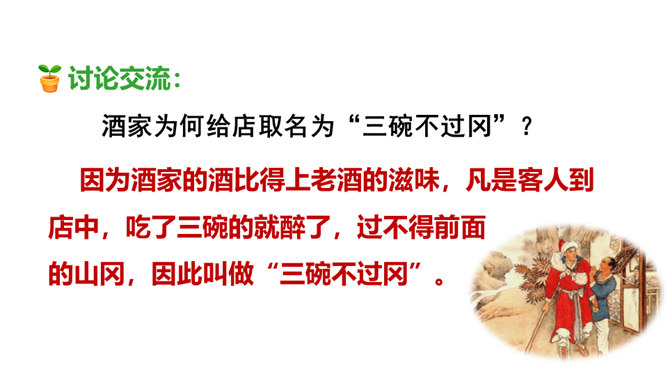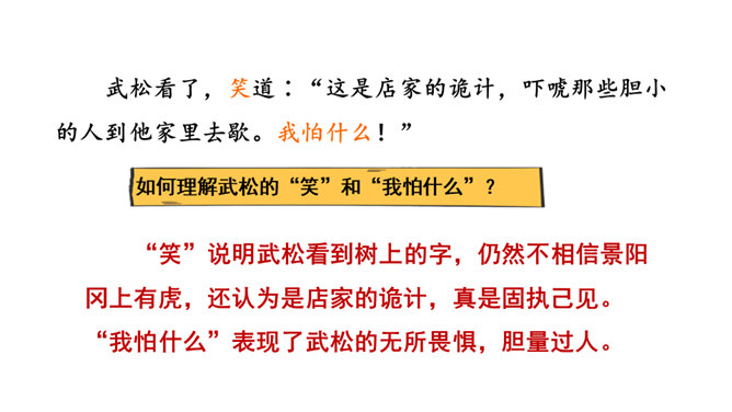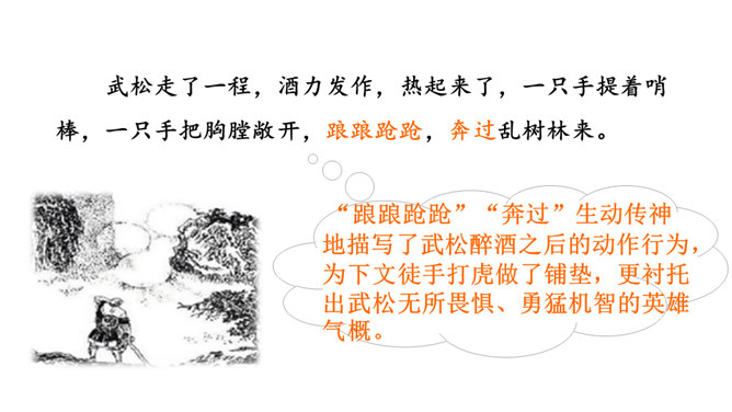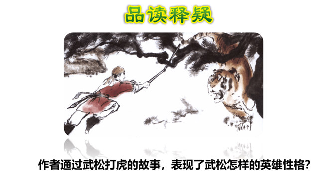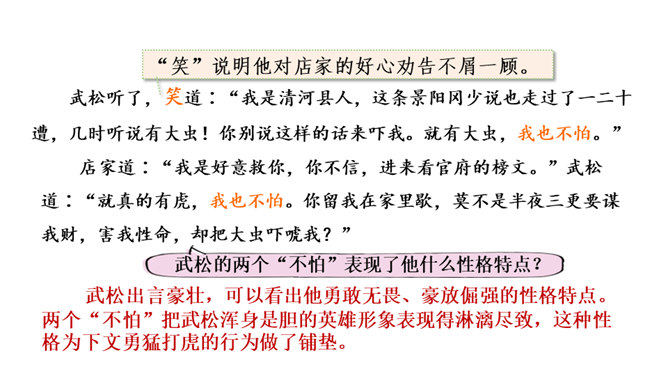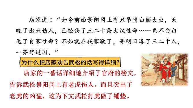 作者通过武松打虎的故事,表现了武松怎样的英雄性格?酒家为何给店取名为“三碗不过冈”?因为酒家的酒比得上老酒的滋味,凡是客人到店中,吃了三碗的就醉了,过不得前面的山冈,因此叫做“三碗不过冈”。店家的一番话详细地介绍了官府的榜文,告诉武松景阳冈上有老虎伤人,而且突出了老虎的凶猛,这为下文武松打虎做了铺垫。武松出言豪壮,可以看出他勇敢无畏、豪放倔强的性格特点。两个“不怕”把武松浑身是胆的英雄形象表现得淋漓尽致,这种性格为下文勇猛打虎的行为做了铺垫。所属专题:景阳冈ppt。