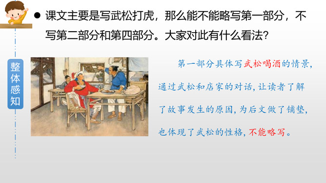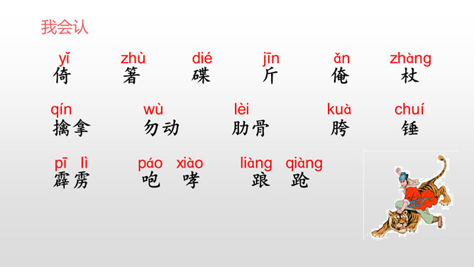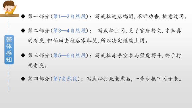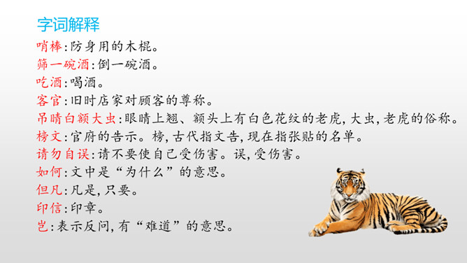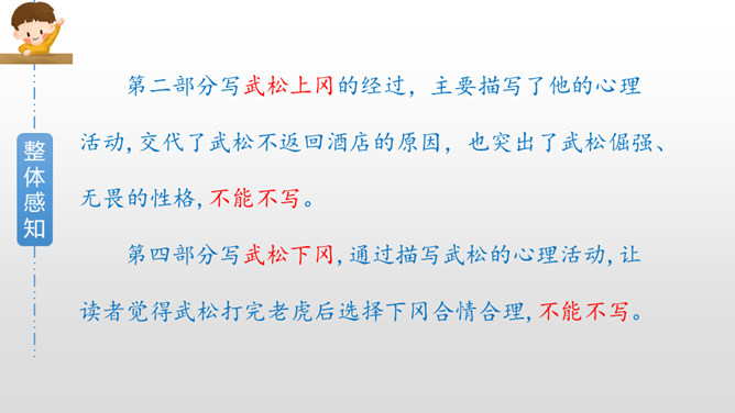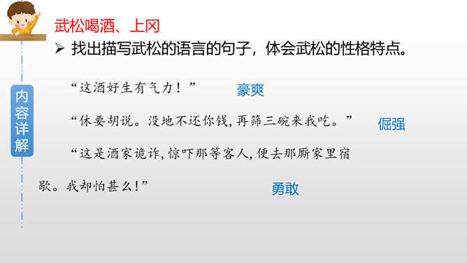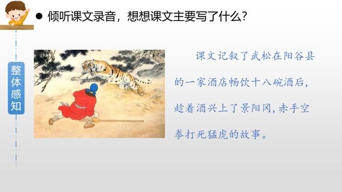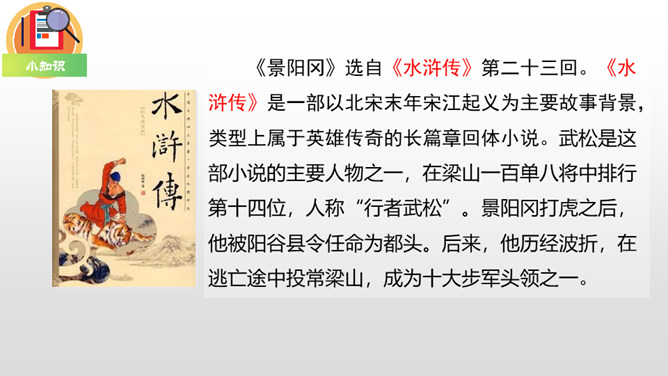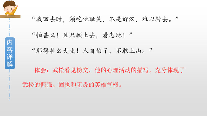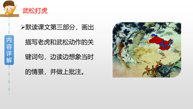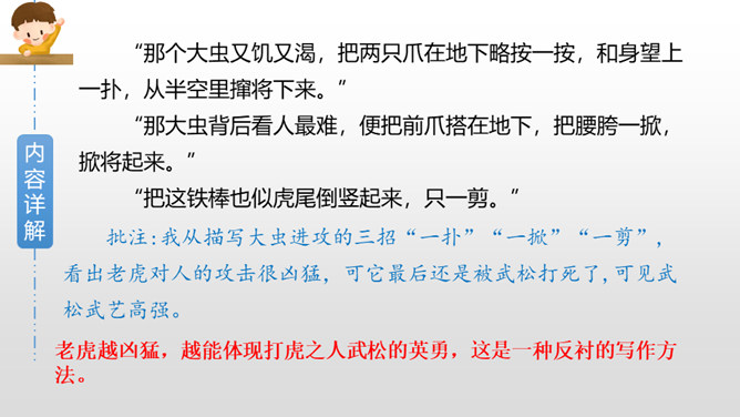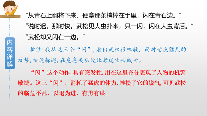 默读课文第三部分,画出描写老虎和武松动作的关键词句,边读边想象当时的情景,并做上批注。批注:我从描写大虫进攻的三招“一扑”“一掀”“一剪”,看出老虎对人的攻击很凶猛,可它最后还是被武松打死了,可见武松武艺高强。老虎越凶猛,越能体现打虎之人武松的英勇,这是一种反衬的写作方法。批注:我从这三个“闪”,看出武松很机敏,面对老虎猛烈的攻势,快速躲避,在危急关头没让老虎攻击成功。所属专题:景阳冈ppt。