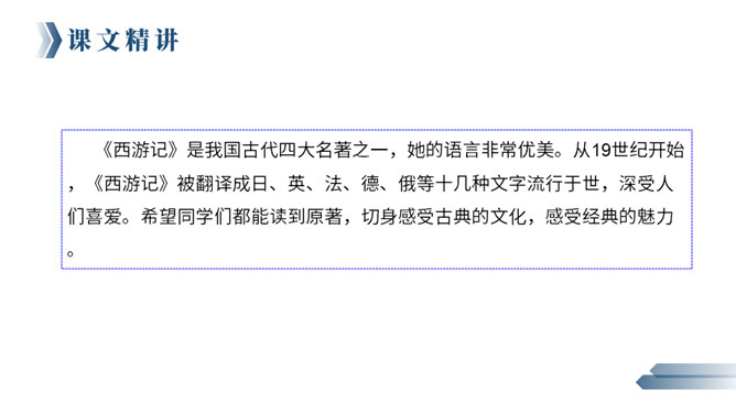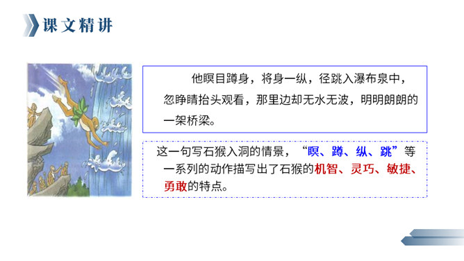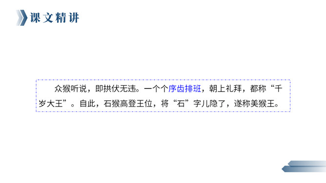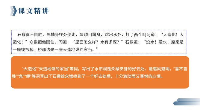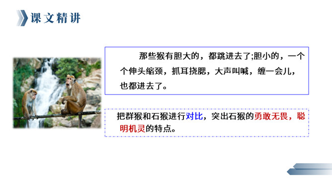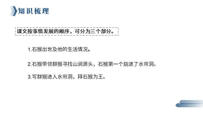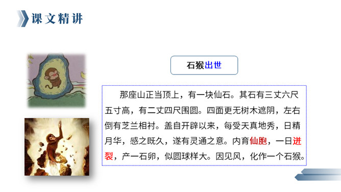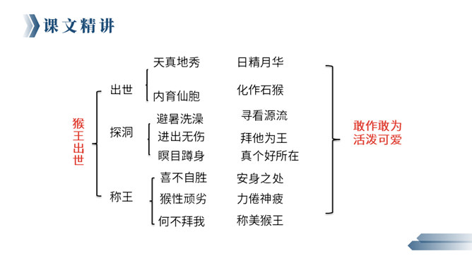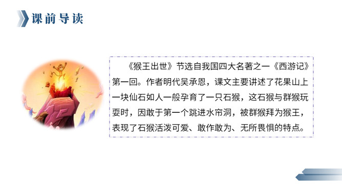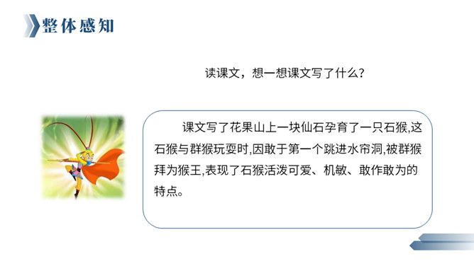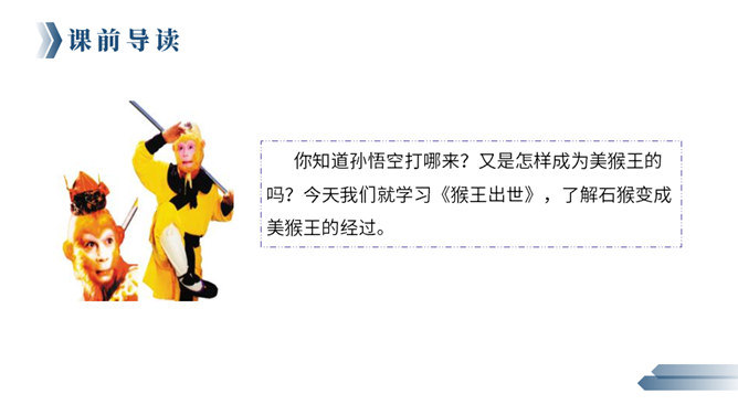 你知道孙悟空打哪来?又是怎样成为美猴王的吗?今天我们就学习《猴王出世》,了解石猴变成美猴王的经过。课文写了花果山上一块仙石孕育了一只石猴,这石猴与群猴玩耍时,因敢于第一个跳进水帘洞,被群猴拜为猴王,表现了石猴活泼可爱、机敏、敢作敢为的特点。课文按事情发展的顺序,可分为三个部分。1.石猴出世及他的生活情况。2.石猴带领群猴寻找山涧源头,石猴第一个跳进了水帘洞。3.写群猴进入水帘洞,拜石猴为王。所属专题:猴王出世ppt。