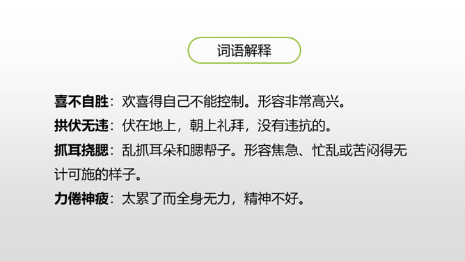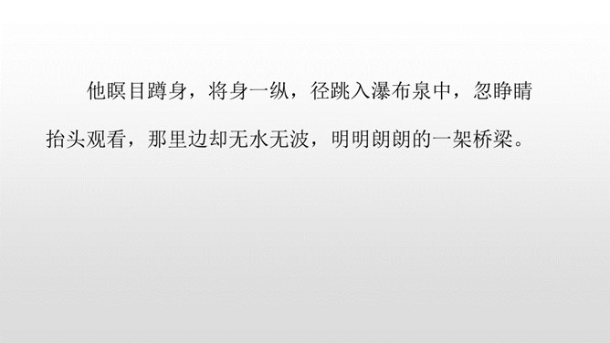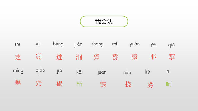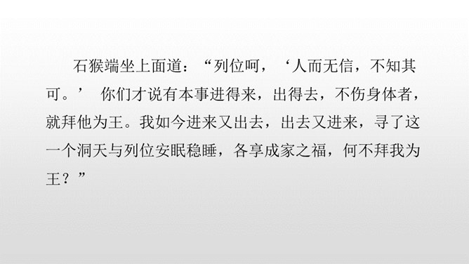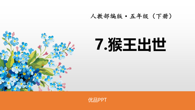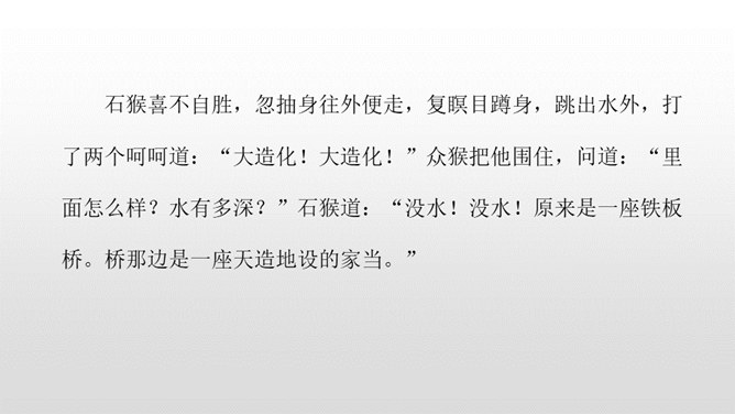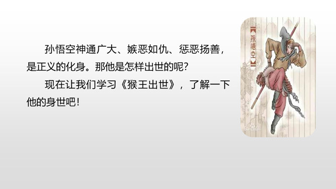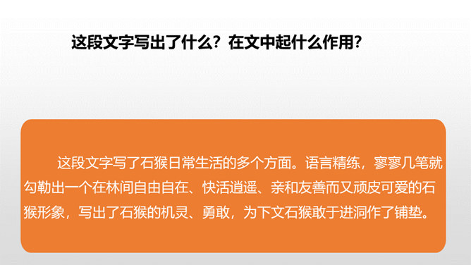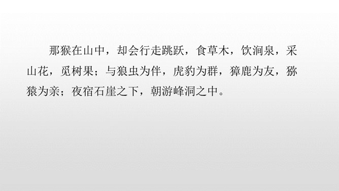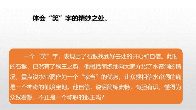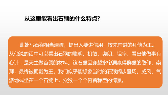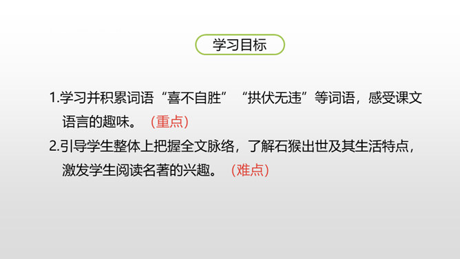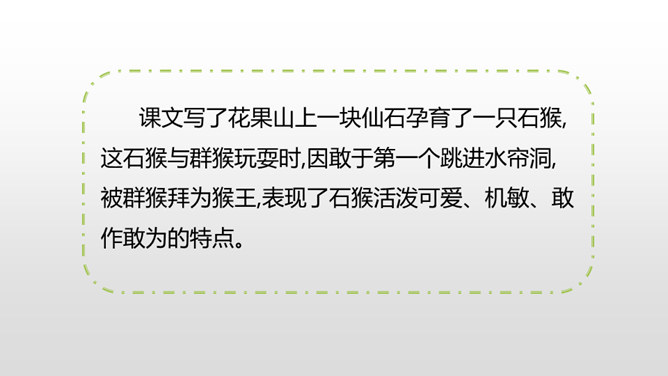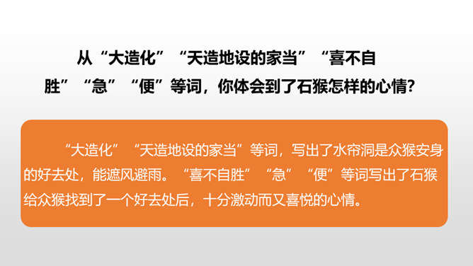 1.学习并积累词语“喜不自胜”“拱伏无违”等词语,感受课文语言的趣味。(重点)2.引导学生整体上把握全文脉络,了解石猴出世及其生活特点,激发学生阅读名著的兴趣。(难点)这段文字写了石猴日常生活的多个方面。语言精练,寥寥几笔就勾勒出一个在林间自由自在、快活逍遥、亲和友善而又顽皮可爱的石猴形象,写出了石猴的机灵、勇敢,为下文石猴敢于进洞作了铺垫。这一句写石猴入洞的情景,“瞑、蹲、纵、跳”等一系列的动作写出了石猴的机智、灵巧、敏捷、勇敢的特点。所属专题:猴王出世ppt。
