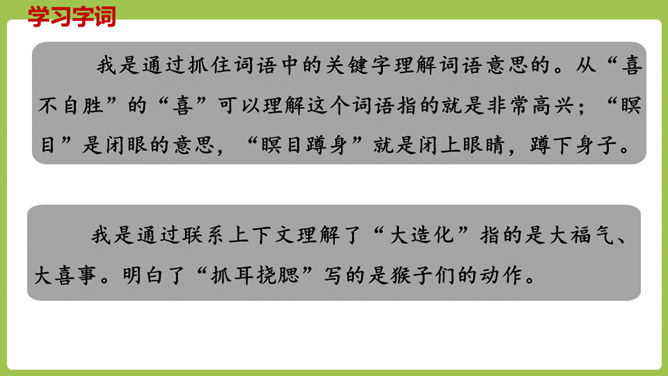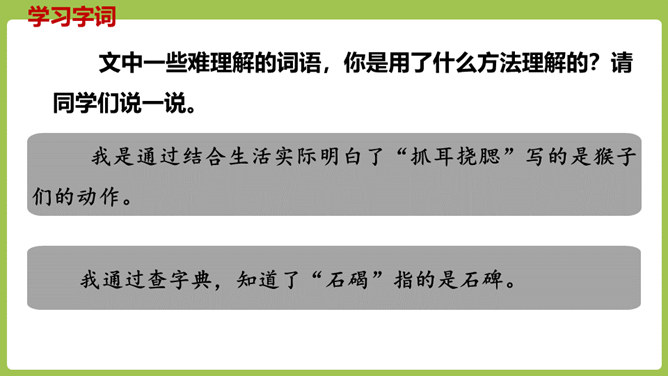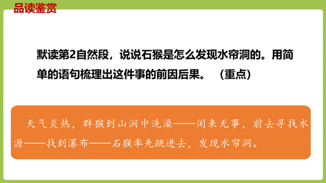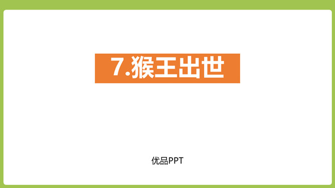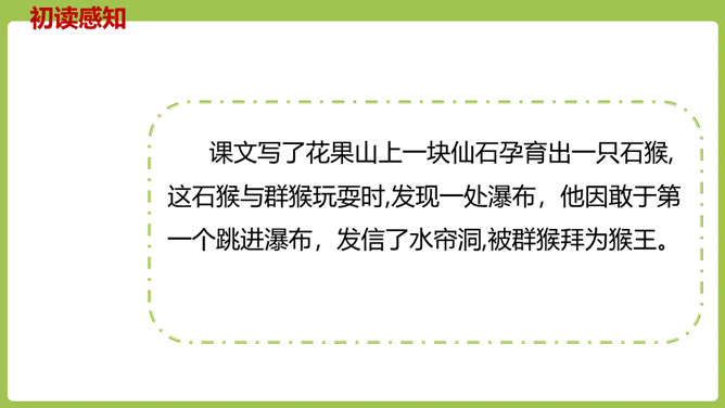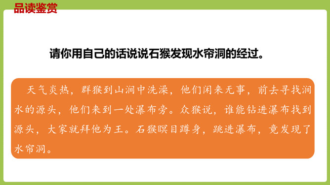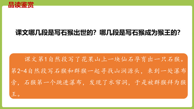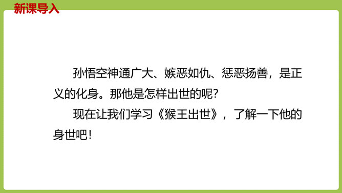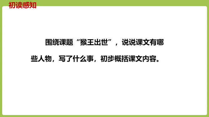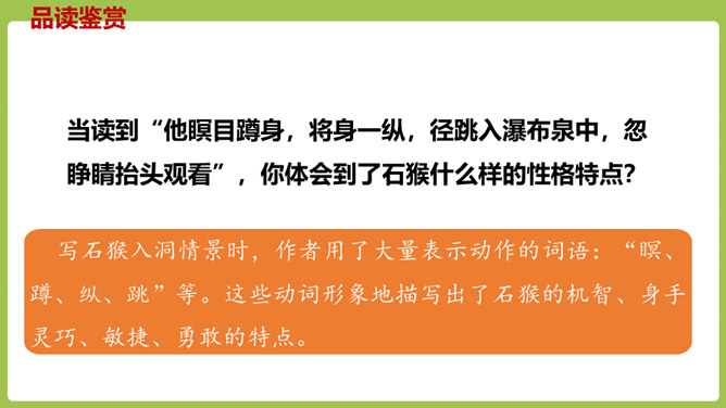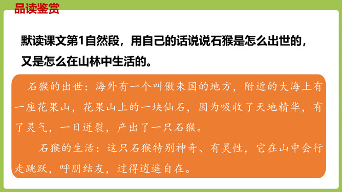 此处写石猴相当清醒,提出人要讲信用,按先前讲的拜他为王。从他说的话中可以看出石猴的聪明、机敏、爽朗、坦率;看出他做事有心计,是天生做首领的材料。这石猴因穿越水帘洞赢得群猴的敬仰、崇拜,最终被拥戴为王。我们似乎能想象当时的石猴阔步登场,威风、气派地端坐在一个石凳上,众猴一个个俯首称臣的情景。学完课文后,想一想:课文题目为什么是“猴王出世”而不是“石猴出世”呢?石猴给你留下了怎么样的印象?所属专题:猴王出世ppt。