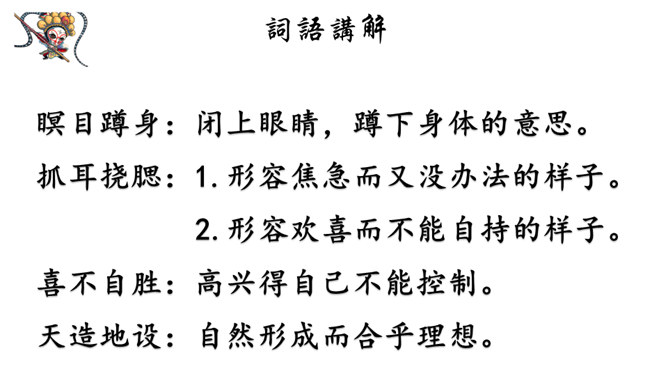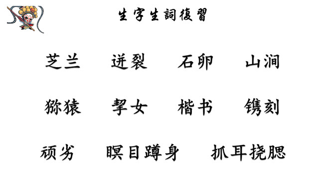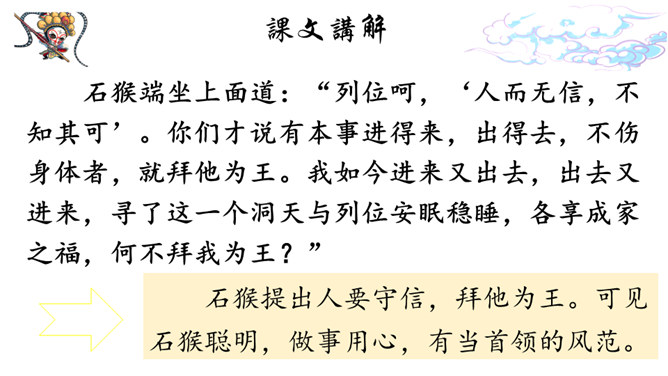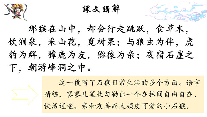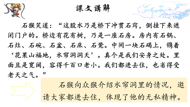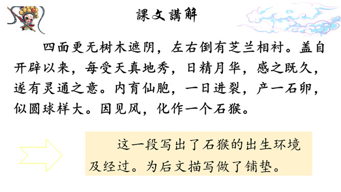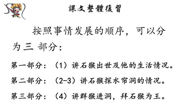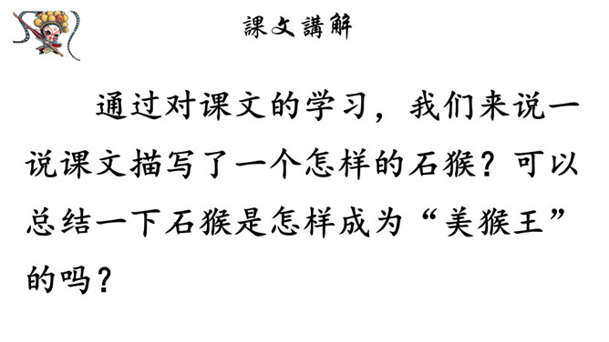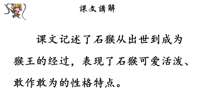 课文记述了石猴从出世到成为猴王的经过,表现了石猴可爱活泼、敢作敢为的性格特点。通过对课文的学习,我们来说一说课文描写了一个怎样的石猴?可以总结一下石猴是怎样成为“美猴王”的吗?按照事情发展的顺序,可以分为三部分:第一部分:(1)讲石猴出世及他的生活情况。第二部分:(2-3)讲石猴探水帘洞的情况。第三部分:(4)讲群猴进洞,拜石猴为王。瞑目蹲身:闭上眼睛,蹲下身体的意思。天造地设:自然形成而合乎理想。所属专题:猴王出世ppt。