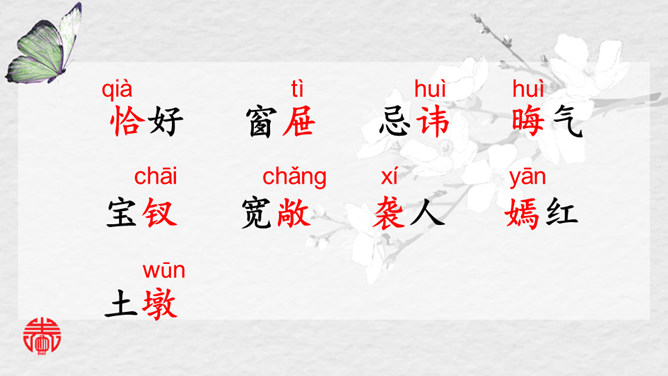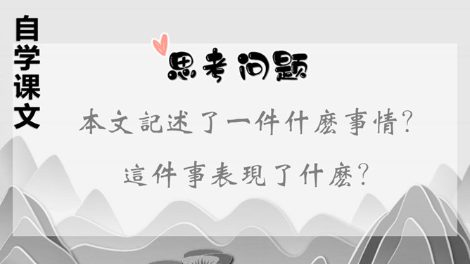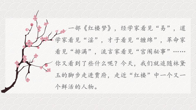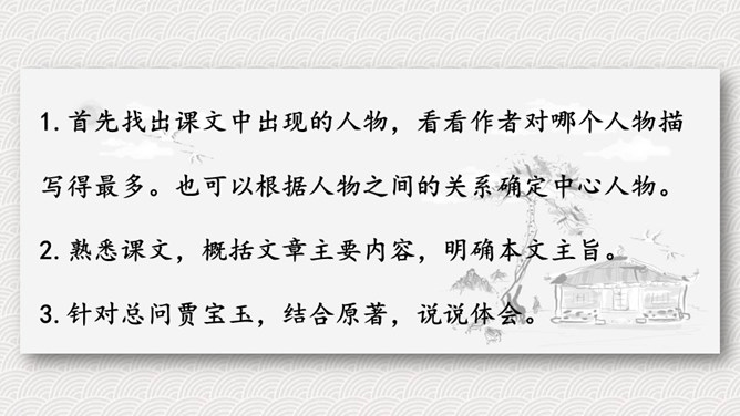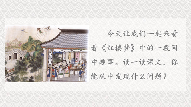 今天让我们一起来看看《红楼梦》中的一段园中趣事。读一读课文,你能从中发现什么问题?1.快速的默读课文,思考课文主要讲了一件什么事情?2.文中不认识的生字生词,查字典解释。课文中的人物有很多,中心人物是谁?本文记述了一件什么事情?这件事表现了什么?对课文中的哪一个人物印象最深?为什么?首先找出课文中出现的人物,看看作者对哪个人物描写得最多。也可以根据人物之间的关系确定中心人物。熟悉课文,概括文章主要内容,明确本文主旨。针对总问贾宝玉,结合原著,说说体会。所属专题:红楼春趣ppt。
