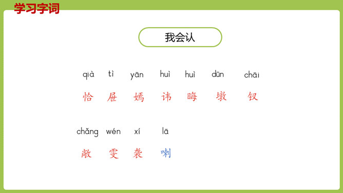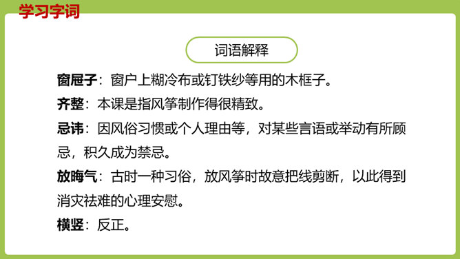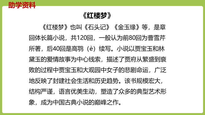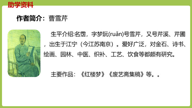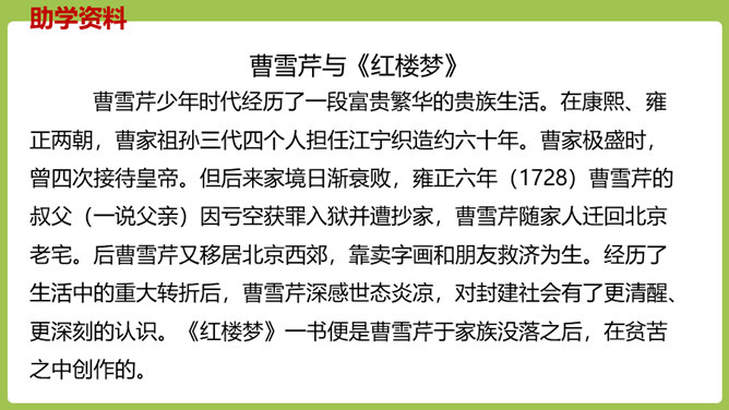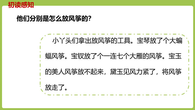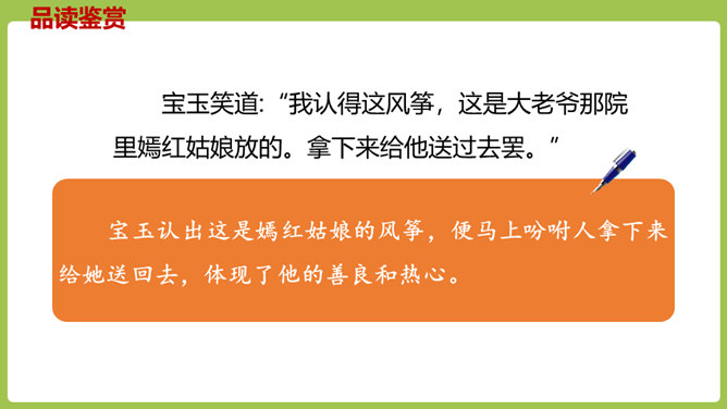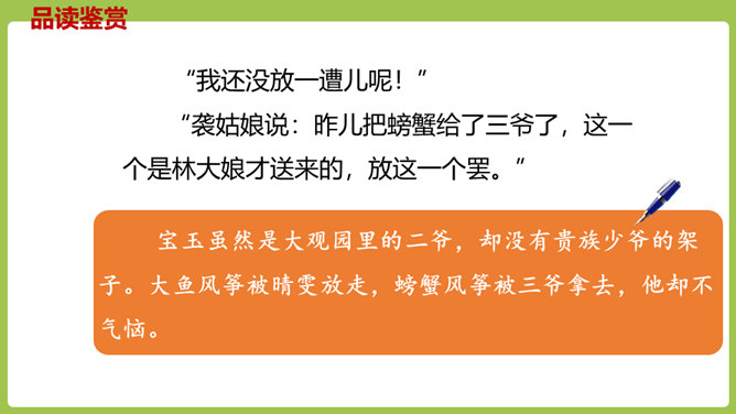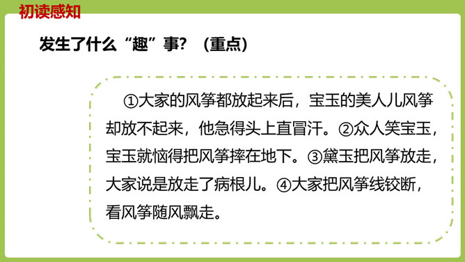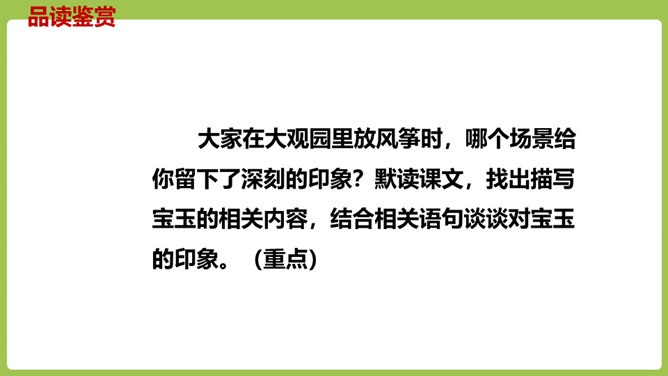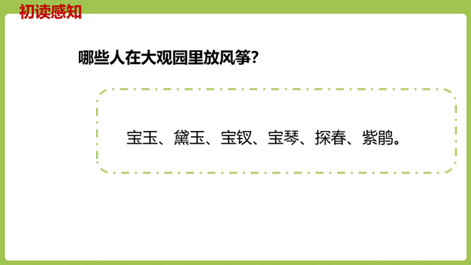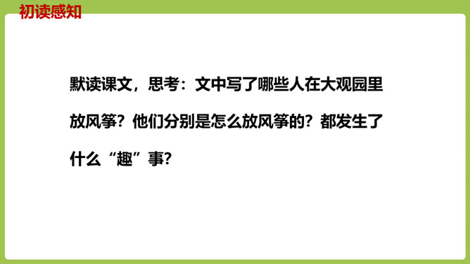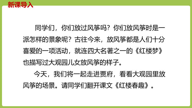 同学们,你们放过风筝吗?你们放风筝时是一派怎样的景象呢?古往今来,放风筝都是人们十分喜爱的一项活动,就连四大名著之一的《红楼梦》也描写过大观园儿女放风筝的样子。今天,我们将一起走进贾府,看看大观园里放风筝的场景。请同学们翻开课文。认真朗读课文,圈出本课生字,遇到不理解的词句时,先大致猜测其意思。默读课文,思考:文中写了哪些人在大观园里放风筝?他们分别是怎么放风筝的?都发生了什么“趣”事?所属专题:红楼春趣ppt。