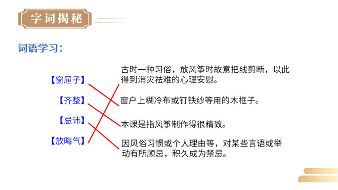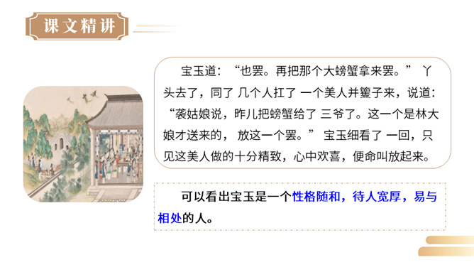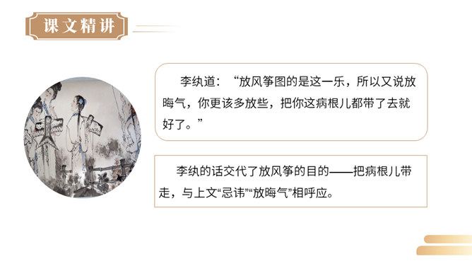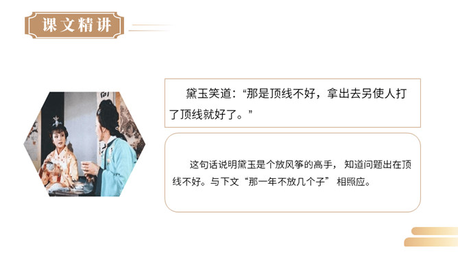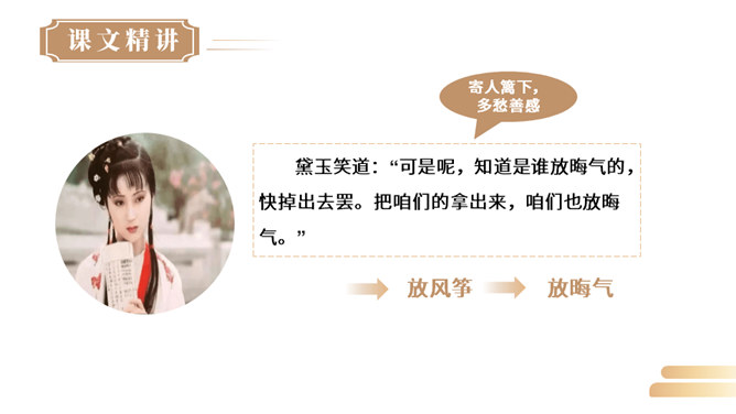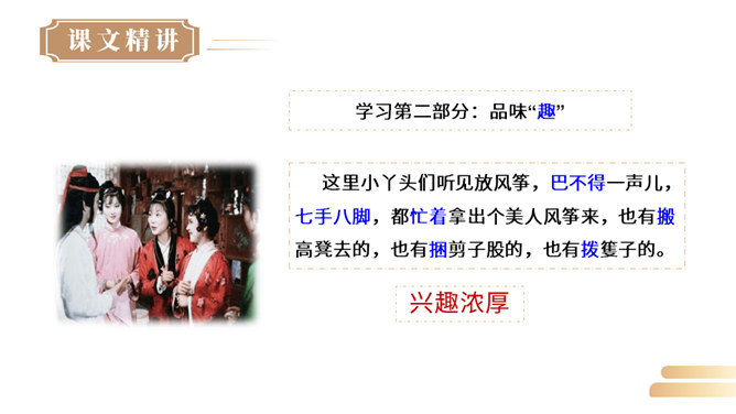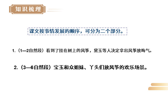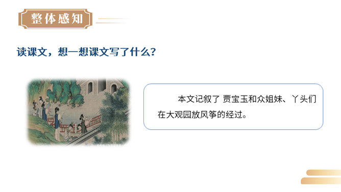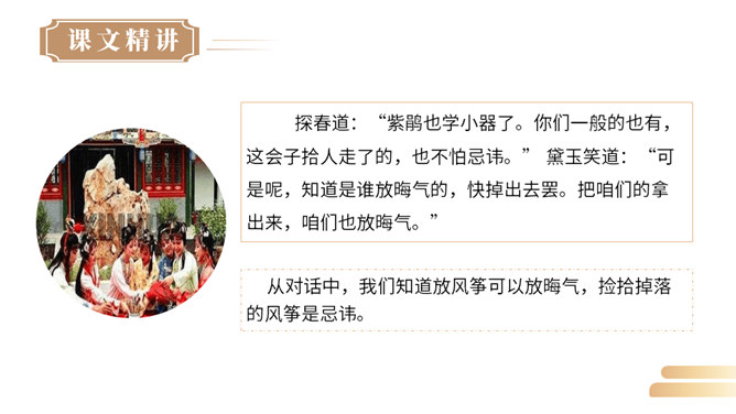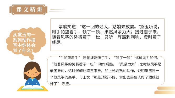 读课文,想一想课文写了什么?本文记叙了 贾宝玉和众姐妹、丫头们在大观园放风筝的经过。课文按事情发展的顺序,可分为二个部分。1.(1—2自然段)看到了挂在树上的风筝,黛玉等人决定拿出风筝放晦气。2.(3—6自然段)宝玉和众姐妹、丫头们放风筝的欢乐场景。从对话中,我们知道放风筝可以放晦气,捡拾掉落的风筝是忌讳。可以看出宝玉是一个性格随和,待人宽厚,易与相处的人。这句话说明黛玉是个放风筝的高手, 知道问题出在顶线不好。与下文“那一年不放几个子” 相照应。所属专题:红楼春趣ppt。