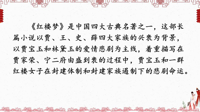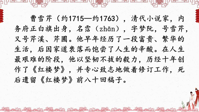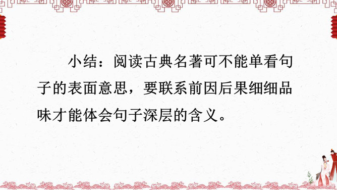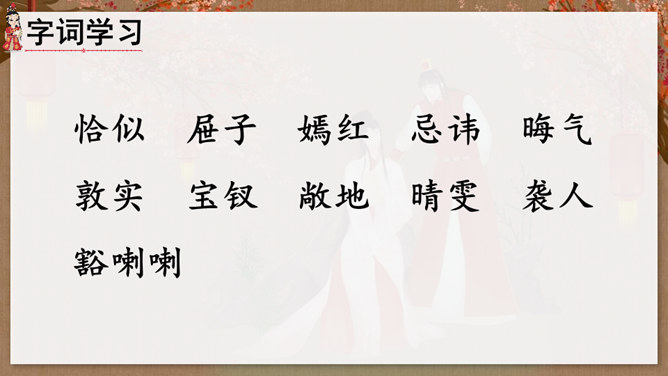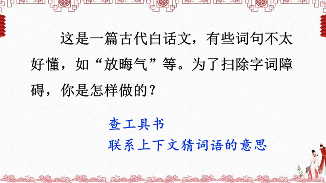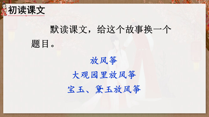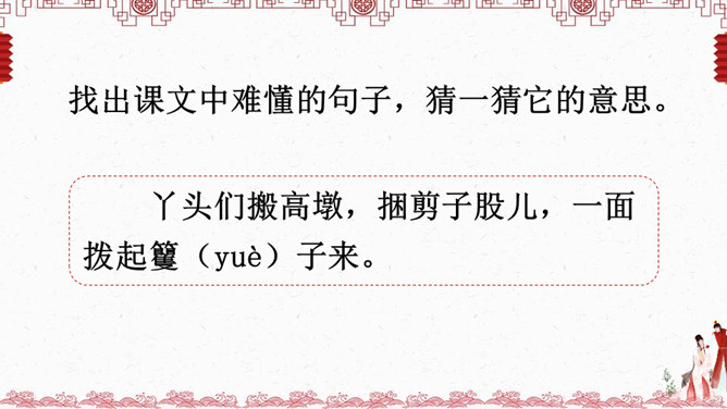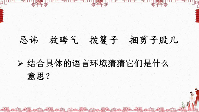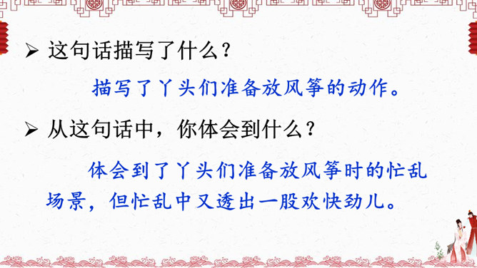 这是一篇古代白话文,有些词句不太好懂,如“放晦气”等。为了扫除字词障碍,你是怎样做的?找出课文中难懂的句子,猜一猜它的意思。这句话描写了什么?描写了丫头们准备放风筝的动作。从这句话中,你体会到什么?体会到了丫头们准备放风筝时的忙乱场景,但忙乱中又透出一股欢快劲儿。小结:阅读古典名著可不能单看句子的表面意思,要联系前因后果细细品味才能体会句子深层的含义。所属专题:红楼春趣ppt。