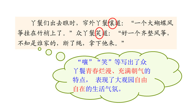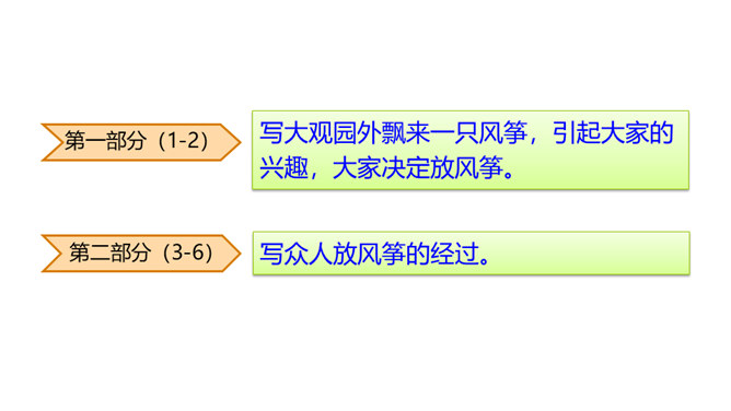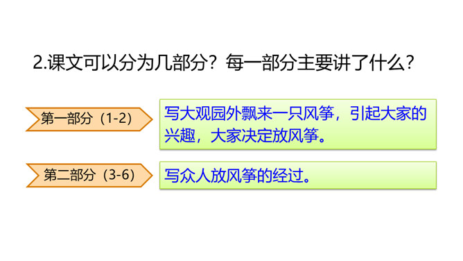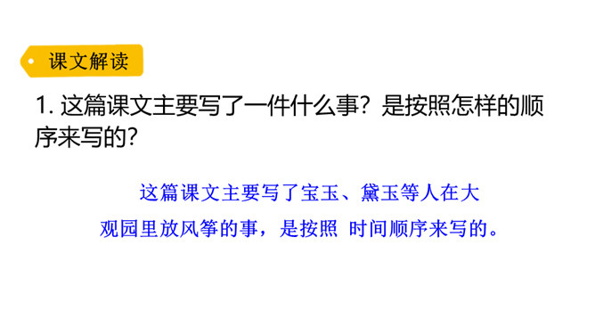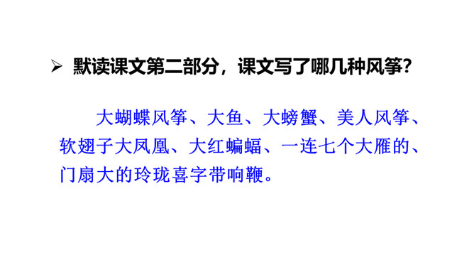 默读课文第二部分,课文写了哪几种风筝?大蝴蝶风筝、大鱼、大螃蟹、美人风筝、软翅子大凤凰、大红蝙蝠、一连七个大雁的、门扇大的玲珑喜字带响鞭。结合相关句子,分析文中主要人物的性格特点。自己喜爱的风筝被别人放走了,贾宝玉却没有恼怒,而是轻轻一句“也罢”就不再追究了,由此可见贾宝玉的宽容大度,不斤斤计较。这段话妙趣横生地写了贾宝玉放风筝的经过,动作和语言描写充分表现了他任性贪玩、活泼调皮的个性。所属专题:红楼春趣ppt。