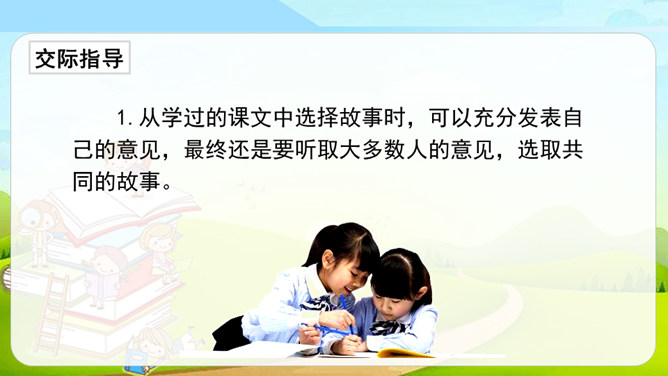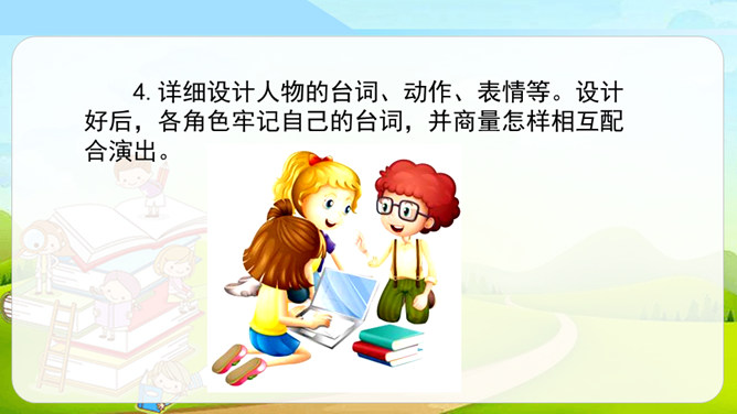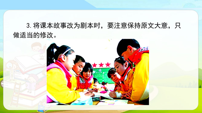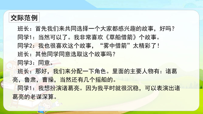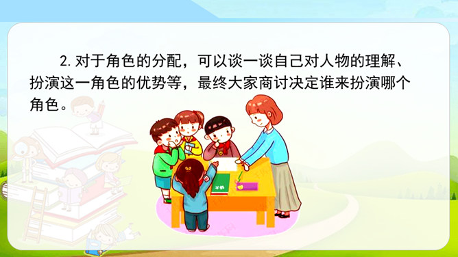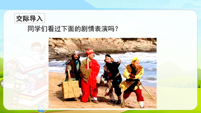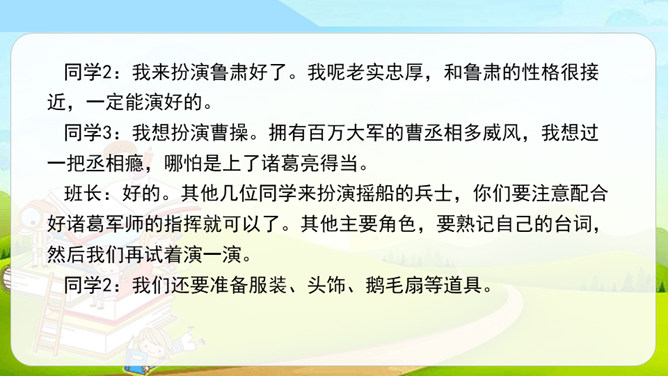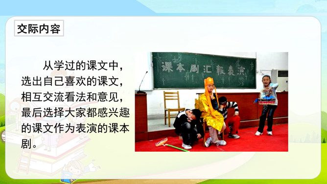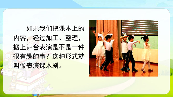 同学们看过下面的剧情表演吗?如果我们把课本上的内容,经过加工、整理,搬上舞台表演是不是一件很有趣的事?这种形式就叫做表演课本剧。从学过的课文中,选出自己喜欢的课文,相互交流看法和意见,最后选择大家都感兴趣的课文作为表演的课本剧。从学过的课文中选择故事时,可以充分发表自己的意见,最终还是要听取大多数人的意见,选取共同的故事。对于角色的分配,可以谈一谈自己对人物的理解、扮演这一角色的优势等,最终大家商讨决定谁来扮演哪个角色。所属专题:我们都来演一演ppt。