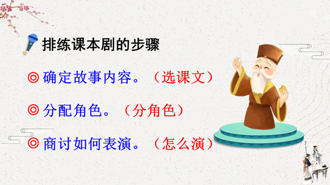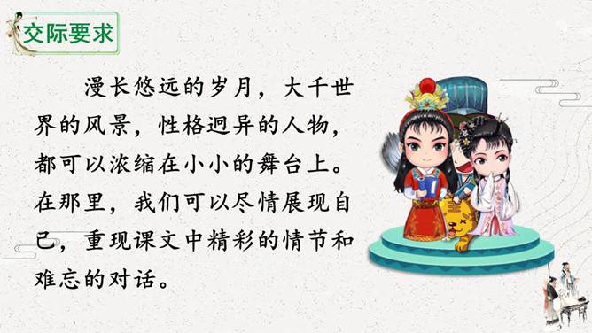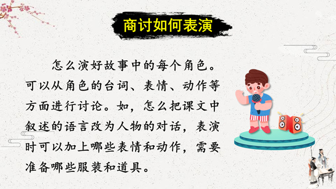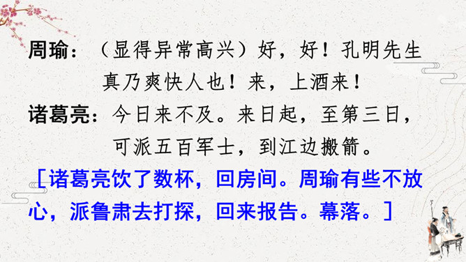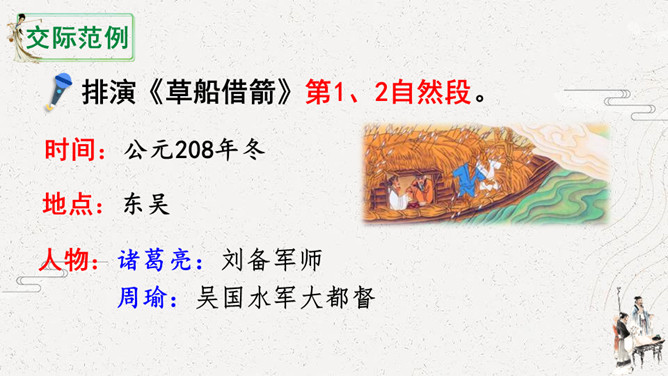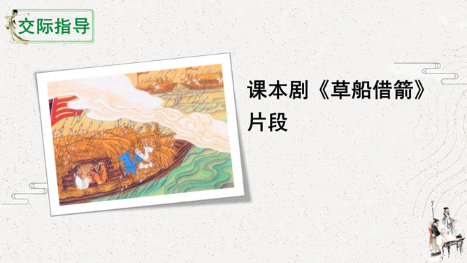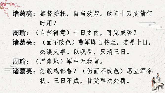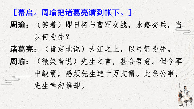怎么演好故事中的每个角色。可以从角色的台词、表情、动作等方面进行讨论。如,怎么把课文中叙述的语言改为人物的对话,表演时可以加上哪些表情和动作,需要准备哪些服装和道具。[幕启。周瑜把诸葛亮请到帐下。]周瑜:(笑着)即日将与曹军交战,水路交兵,当以何为先?诸葛亮:(肯定地说)大江之上,以弓箭为先。周瑜:(微笑着说)先生之言,甚合吾意。但今军中缺箭,感烦先生造十万支箭。此系公事,先生幸勿推却。所属专题:我们都来演一演ppt。