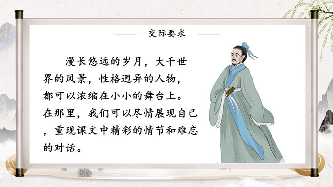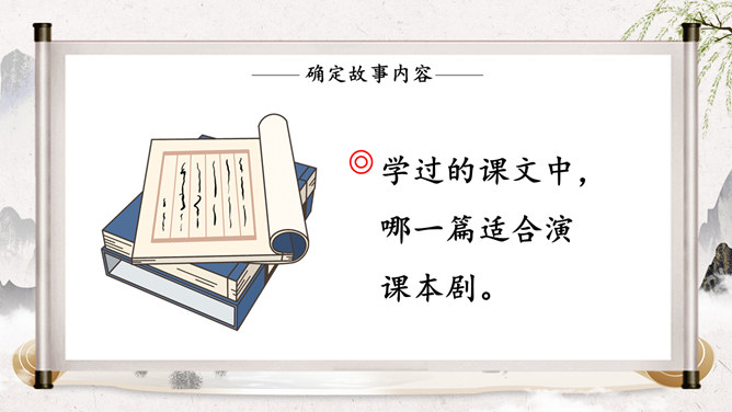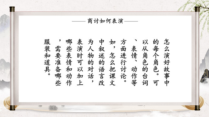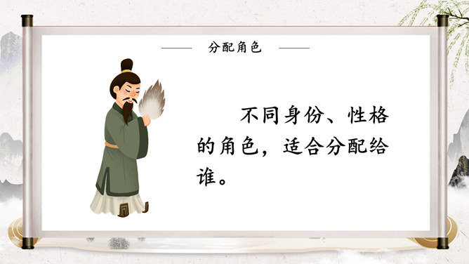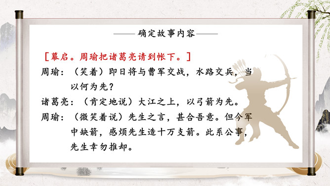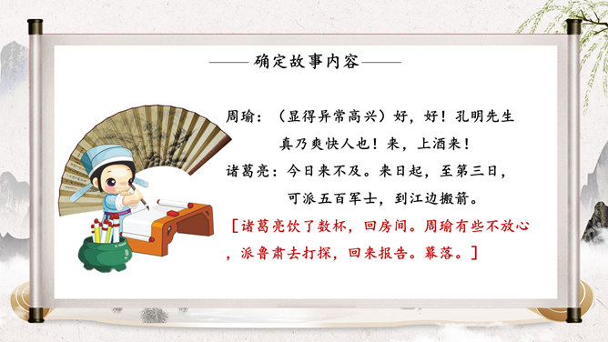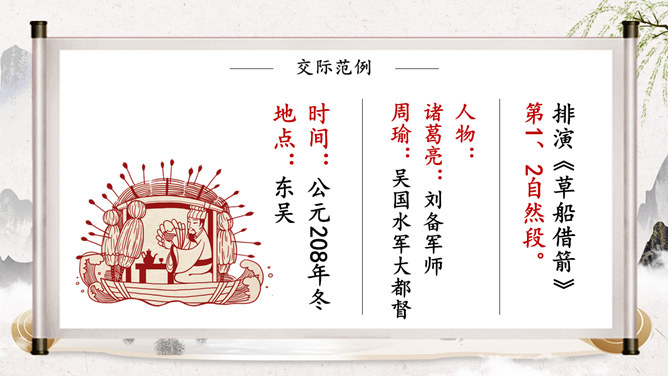 排练课本剧的步骤:确定故事内容。(选课文)分配角色。(分角色)商讨如何表演。(怎么演)学过的课文中,哪一篇适合演课本剧。不同身份、性格的角色,适合分配给谁。诸葛亮:都督委托,自当效劳。敢问十万支箭何时用?周瑜:(有些得意)十日之内,可完成否?诸葛亮:(面不改色)曹军即日将至,若是十日,必误大事。以我看,只消三日。周瑜:(严肃地)军中无戏言。诸葛亮:怎敢戏都督?(仍面不改色)愿立军令状。所属专题:我们都来演一演ppt。