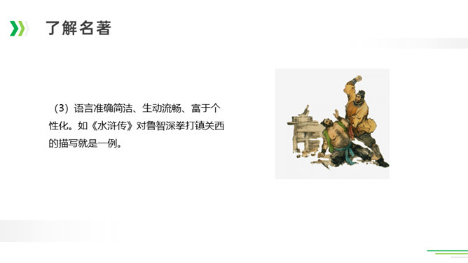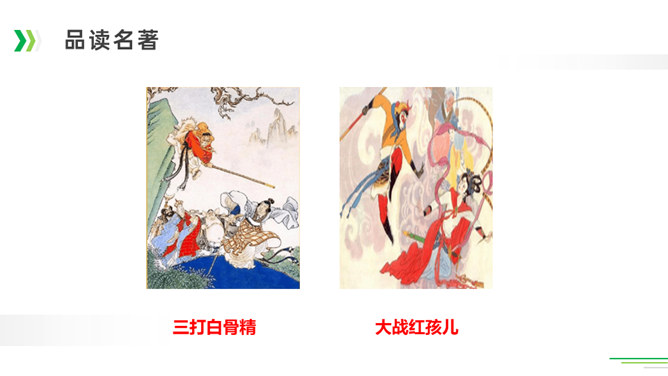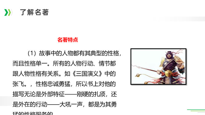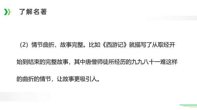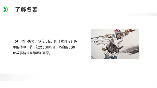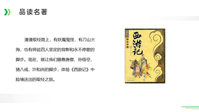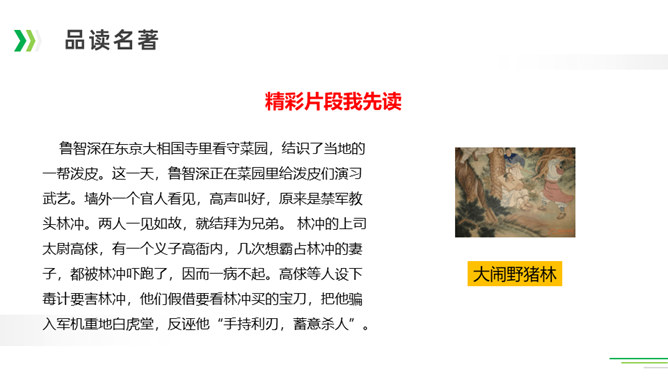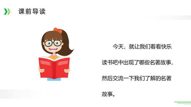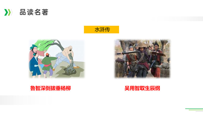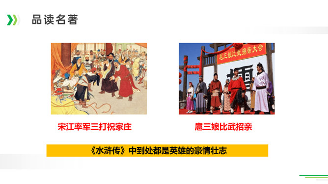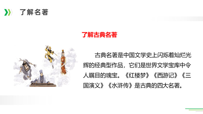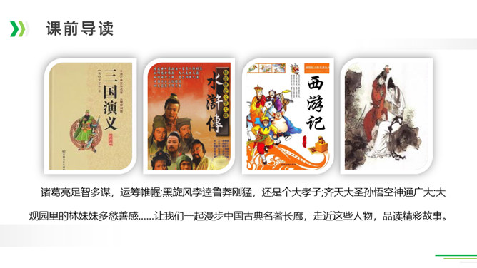 诸葛亮足智多谋,运筹帷幄;黑旋风李逵鲁莽刚猛,还是个大孝子;齐天大圣孙悟空神通广大;大观园里的林妹妹多愁善感……让我们一起漫步中国古典名著长廊,走近这些人物,品读精彩故事。今天,就让我们看看快乐读书吧中出现了哪些名著故事,然后交流一下我们了解的名著故事。古代长篇小说多是章回体小说。把一回或几回连起来组成一个相对完整的故事,连起来就串成了一个长篇故事。认真读每一回的“回目”,通过这些题目就能猜出这一回讲的主要内容。翻开一本书就等于见证了璀璨无比历史的长河,知兴衰荣辱,看世态炎凉,品百味人生。所属专题:读古典名著,品百味人生ppt。