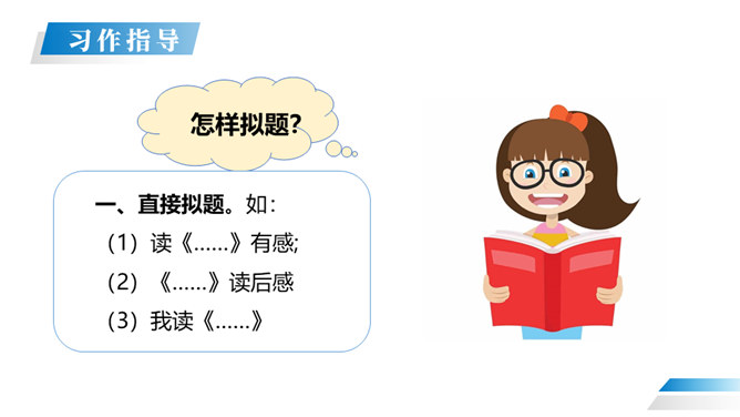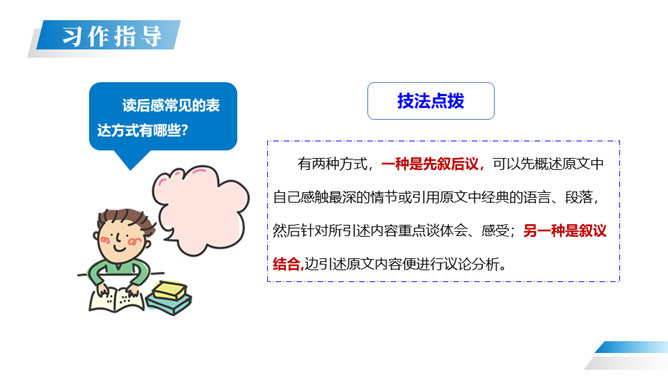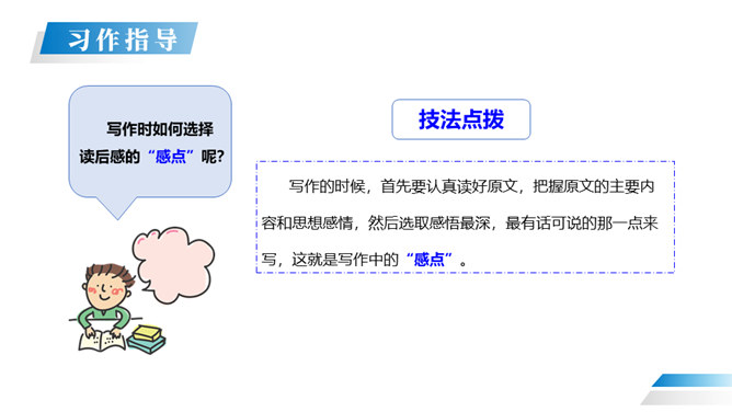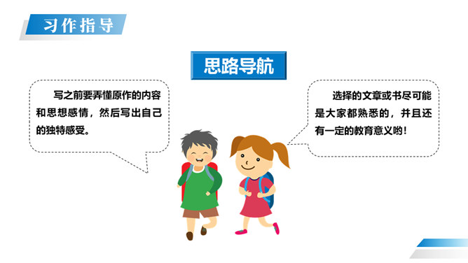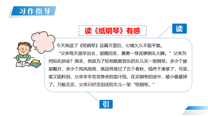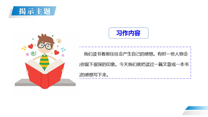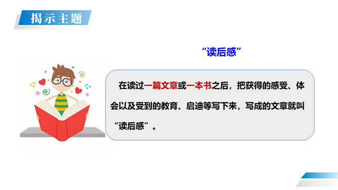 在读过一篇文章或一本书之后,把获得的感受、体会以及受到的教育、启迪等写下来,写成的文章就叫“读后感”。 我们读书看报往往会产生自己的感想。有时一些人物会给你留下很深的印象。今天我们就把读过一篇文章或一本书后的感想写下来。写作的时候,首先要认真读好原文,把握原文的主要内容和思想感情,然后选取感悟最深,最有话可说的那一点来写,这就是写作中的“感点”。所属专题:写读后感ppt。