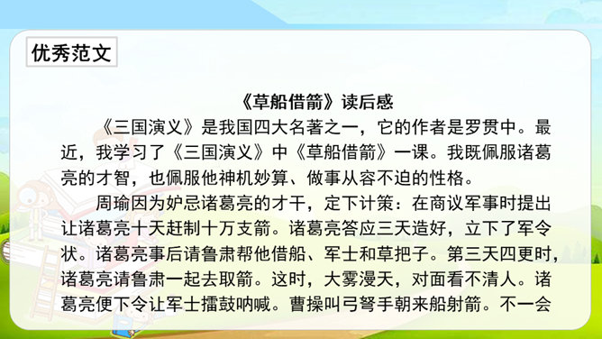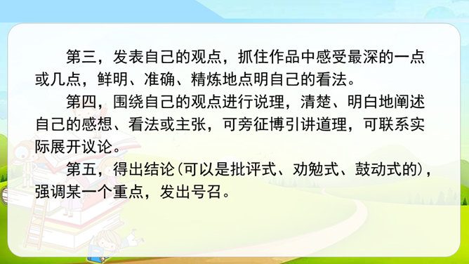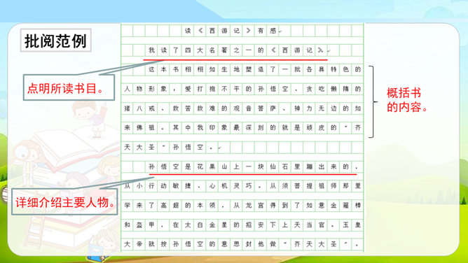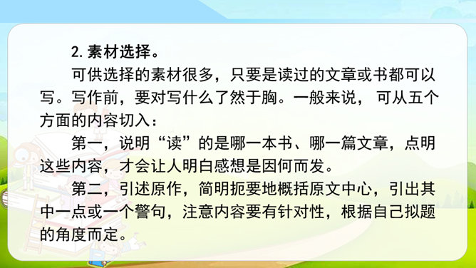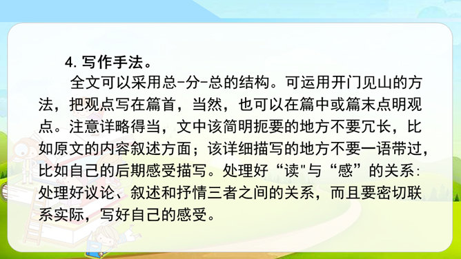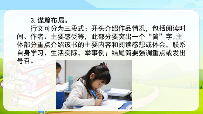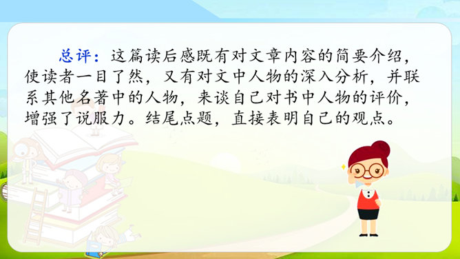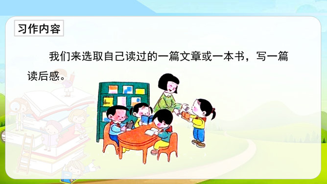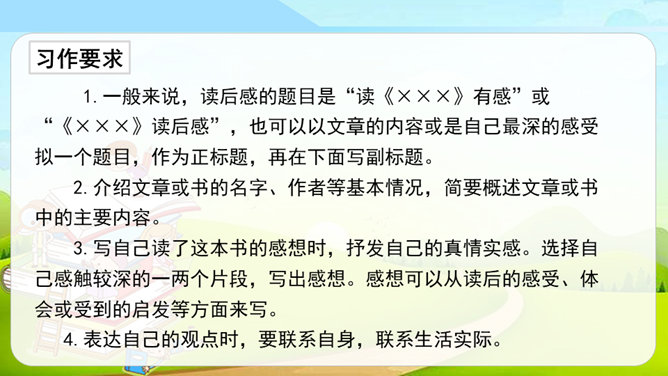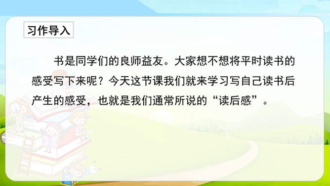 书是同学们的良师益友。大家想不想将平时读书的感受写下来呢?今天这节课我们就来学习写自己读书后产生的感受,也就是我们通常所说的“读后感”。写自己读了这本书的感想时,抒发自己的真情实感。选择自己感触较深的一两个片段,写出感想。感想可以从读后的感受、体会或受到的启发等方面来写。介绍文章或书的名字、作者等基本情况,简要概述文章或书中的主要内容。表达自己的观点时,要联系自身,联系生活实际。所属专题:写读后感ppt。
