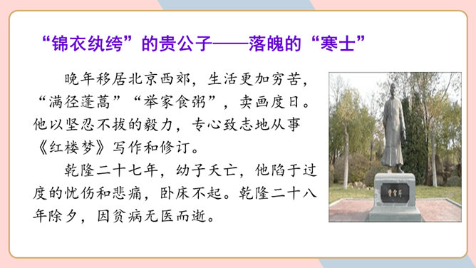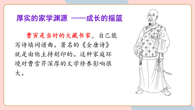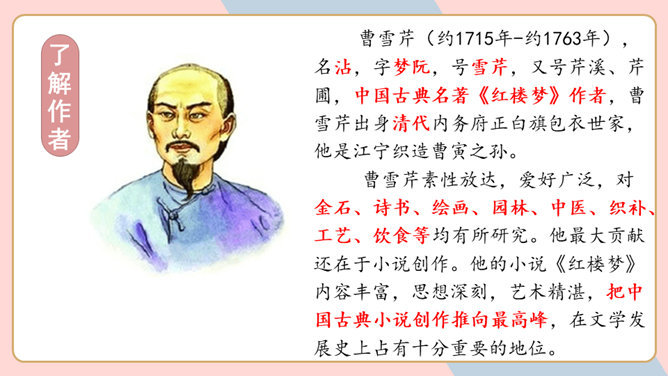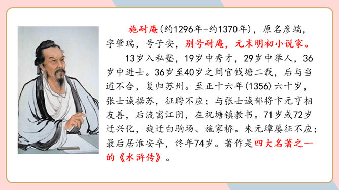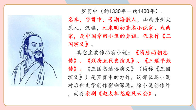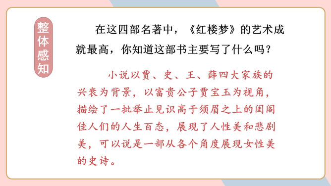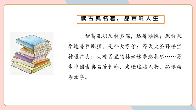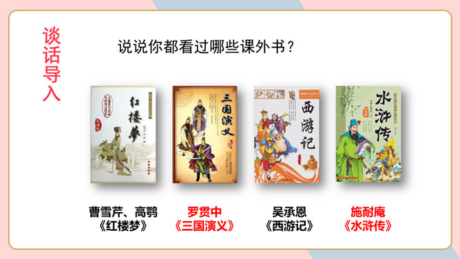 交流其他几部书的主要内容和主要人物。你最喜欢哪个人物?你最佩服谁?你最想读哪本书?同学们,这节课我们了解了四大名著的内容及主要人物,也熟悉了一些读书方法。请同学们课后就到图书馆去借阅,也可到书店购买阅读。你可以拣自己喜欢的内容看,可以囫囵吞枣地看,也可以找到自己感兴趣的内功精读,还可以和这部书拍成的电视剧对照读。所属专题:读古典名著,品百味人生ppt。