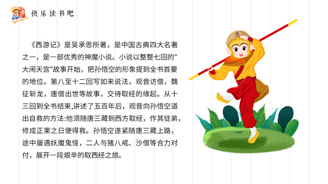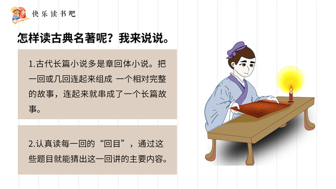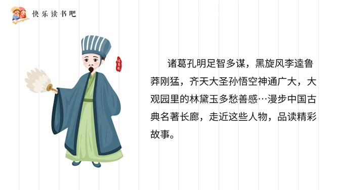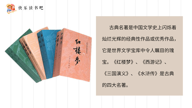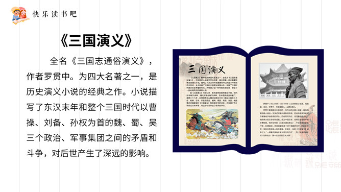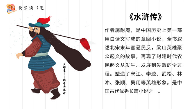 《三国演义》全名《三国志通俗演义》,作者罗贯中。为四大名著之一,是历史演义小说的经典之作。小说描写了东汉末年和整个三国时代以曹操、刘备、孙权为首的魏、蜀、吴三个政治、军事集团之间的矛盾和斗争,对后世产生了深远的影响。《水浒传》作者施耐庵,是中国历史上第一部用白话文写成的章回小说,全书叙述北宋末年官逼民反,梁山英雄聚众起义的故事,再现了封建时代农民起义从发生、发展到失败的全过程。塑造了宋江、李逵、武松、林冲、张顺、吴用等英雄形象。是中国古代优秀长篇小说之一。所属专题:读古典名著,品百味人生ppt。