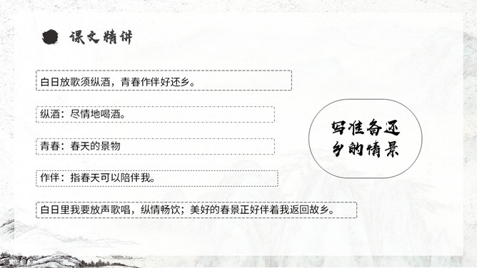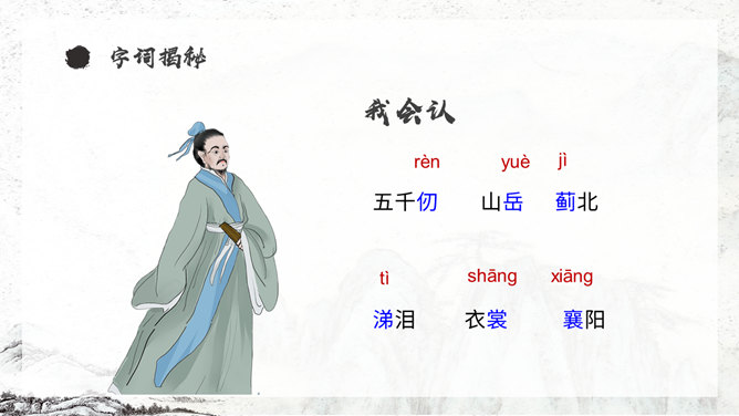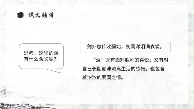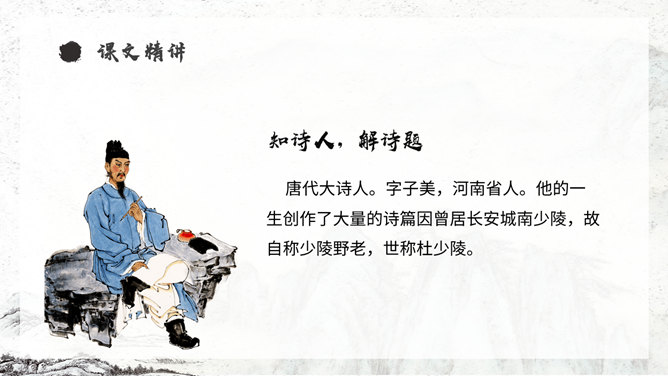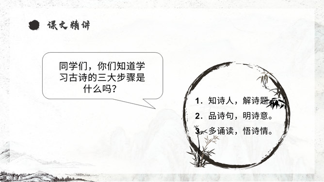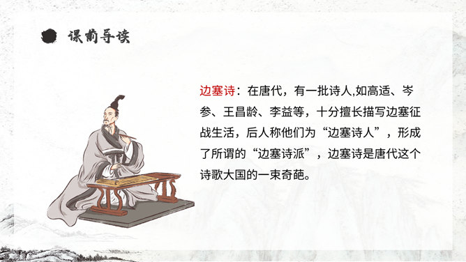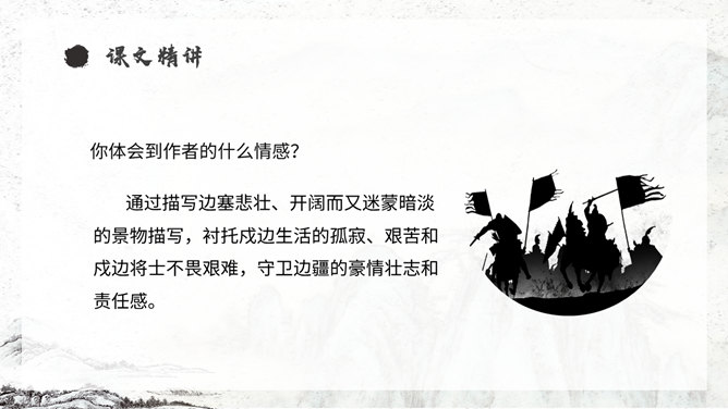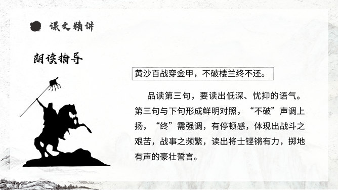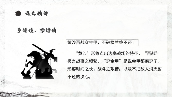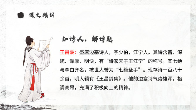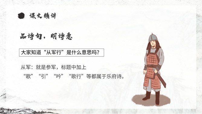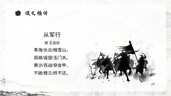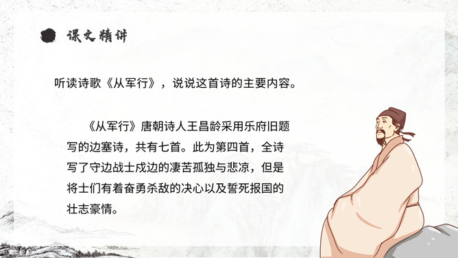 《从军行》唐朝诗人王昌龄采用乐府旧题写的边塞诗,共有七首。此为第四首,全诗写了守边战士戍边的凄苦孤独与悲凉,但是将士们有着奋勇杀敌的决心以及誓死报国的壮志豪情。同学们,你们知道学习古诗的三大步骤是什么吗?1.知诗人,解诗题。2.品诗句,明诗意。3.多诵读,悟诗情。通过描写边塞悲壮、开阔而又迷蒙暗淡的景物描写,衬托戍边生活的孤寂、艰苦和戍边将士不畏艰难,守卫边疆的豪情壮志和责任感。