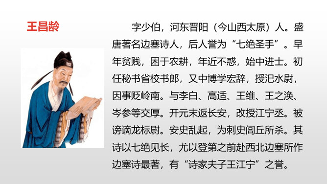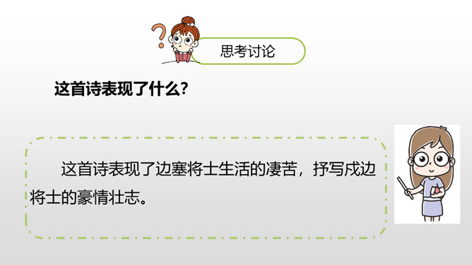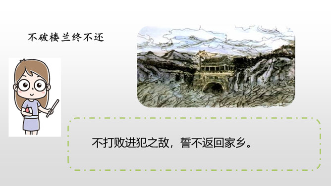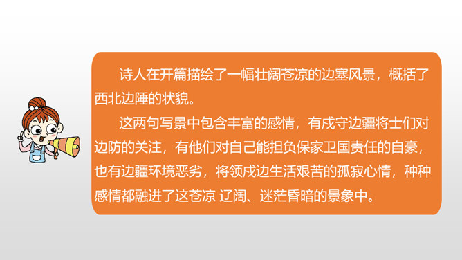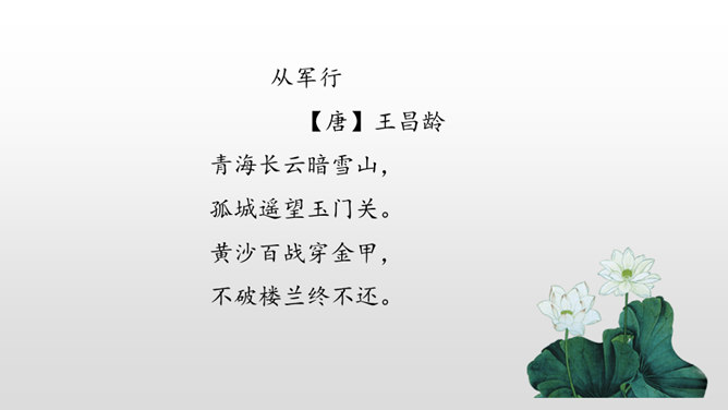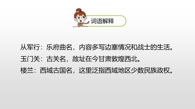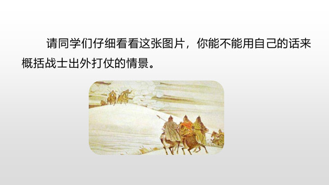 1.学会本课生字,理解古诗的意思。(重点)2.借助朗读、想象感悟诗文的美好意境,使学生从中受到美的熏陶,正确地体会作者的思想感情。(难点)请同学们仔细看看这张图片,你能不能用自己的话来概括战士出外打仗的情景。诗人在开篇描绘了一幅壮阔苍凉的边塞风景,概括了西北边陲的状貌。这两句写景中包含丰富的感情,有戍守边疆将士们对边防的关注,有他们对自己能担负保家卫国责任的自豪,也有边疆环境恶劣,将领戍边生活艰苦的孤寂心情,种种感情都融进了这苍凉 辽阔、迷茫昏暗的景象中。所属专题:从军行ppt。